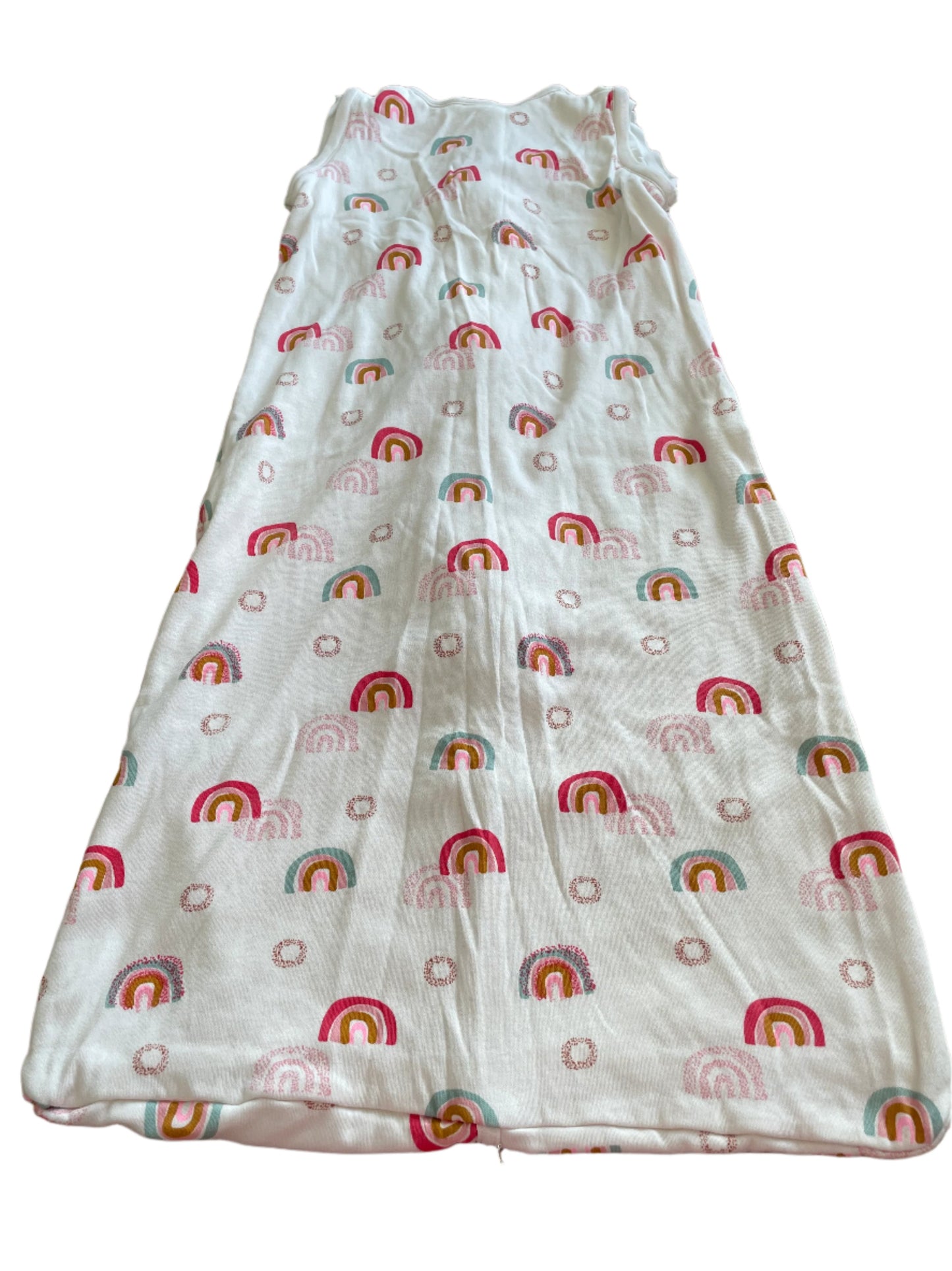 Deze witte babyslaapzak met regenboogprint heeft een lange rits met kinbescherming, die de tere huid van de baby bij de nek beschermt. De slaapzak bestaat uit twee lagen katoen met een zachte vulling. Een slaapzak of schopzak helpt je kindje om veilig en rustig te slapen, want omrollen of uit bed klimmen is een stuk lastiger. Het slaapzak heeft ook afritsbare mouwen van Hema. Maat 68 - 80 , 4 - 12 maanden