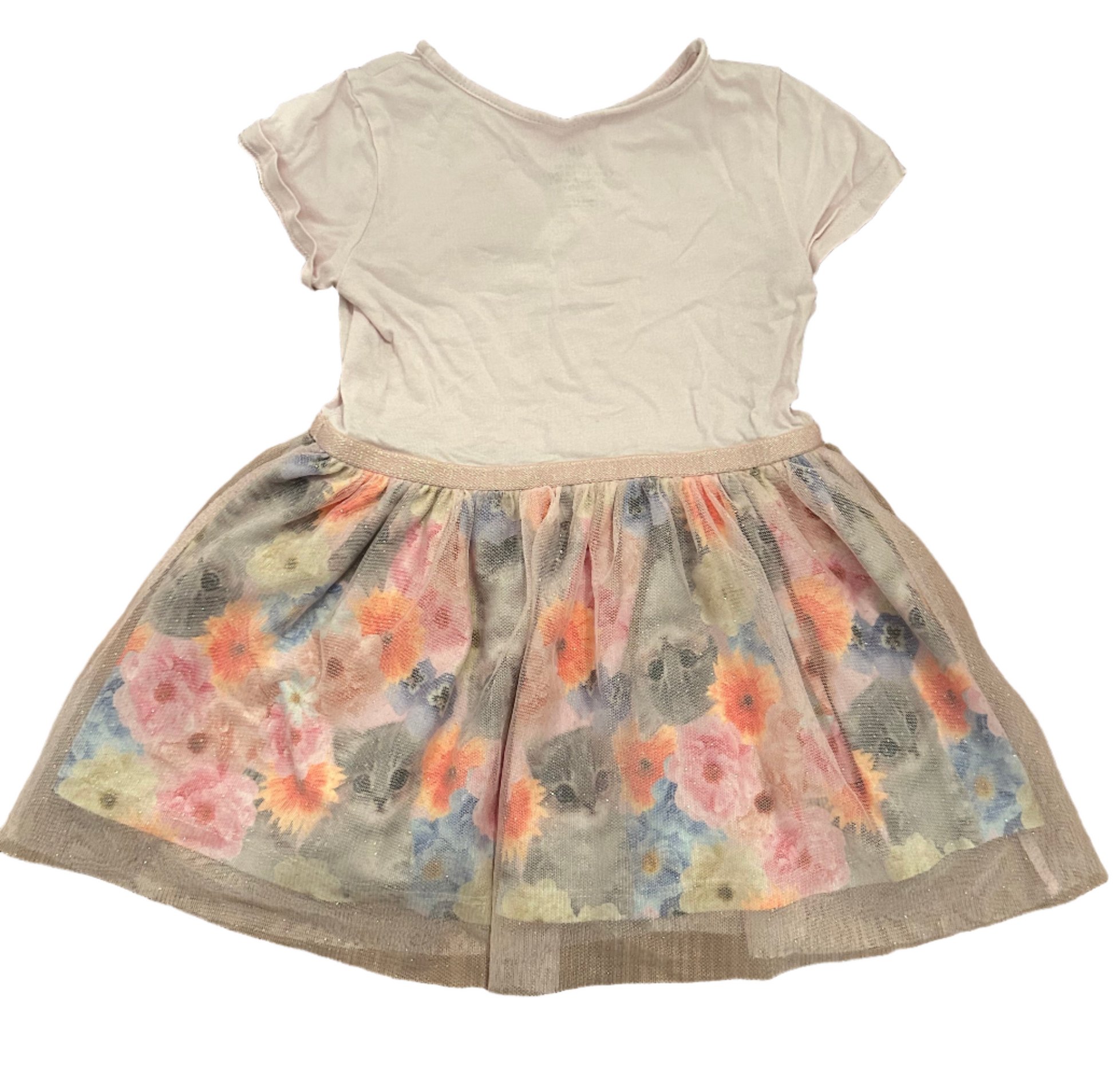 Een korte mouw jurk een volumineuze rok gemaakt van een dubbele laag tule met een patroon. Het model heeft een ronde hals en een prachtig kattenontwerp. 1,5 - 2 jaar oud