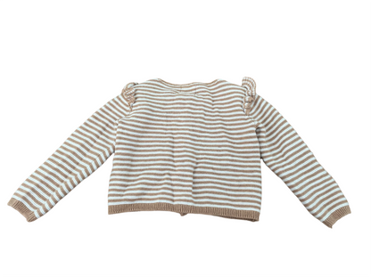 Wit en bruin gestreepte trui met knopen aan de voorkant, de trui heeft franjes op de schouders. Maat 74 (6 - 9 maanden) 100% katoen van C&A