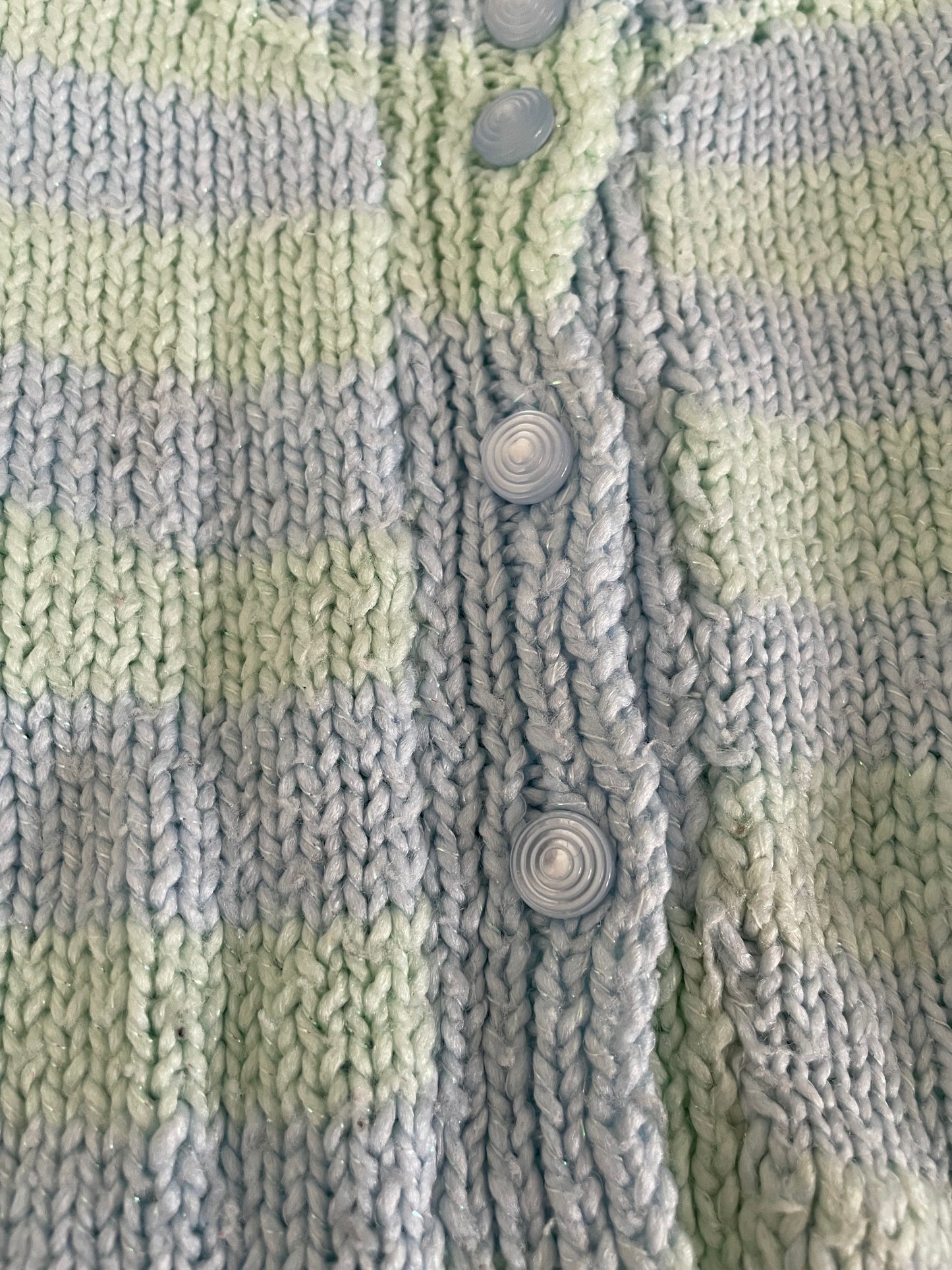 Gebreide blauw en groen gestreepte trui met knopen aan de voorkant, lange mouw. Maat 92-98 (2-3 jaar) zelfgemaakt
