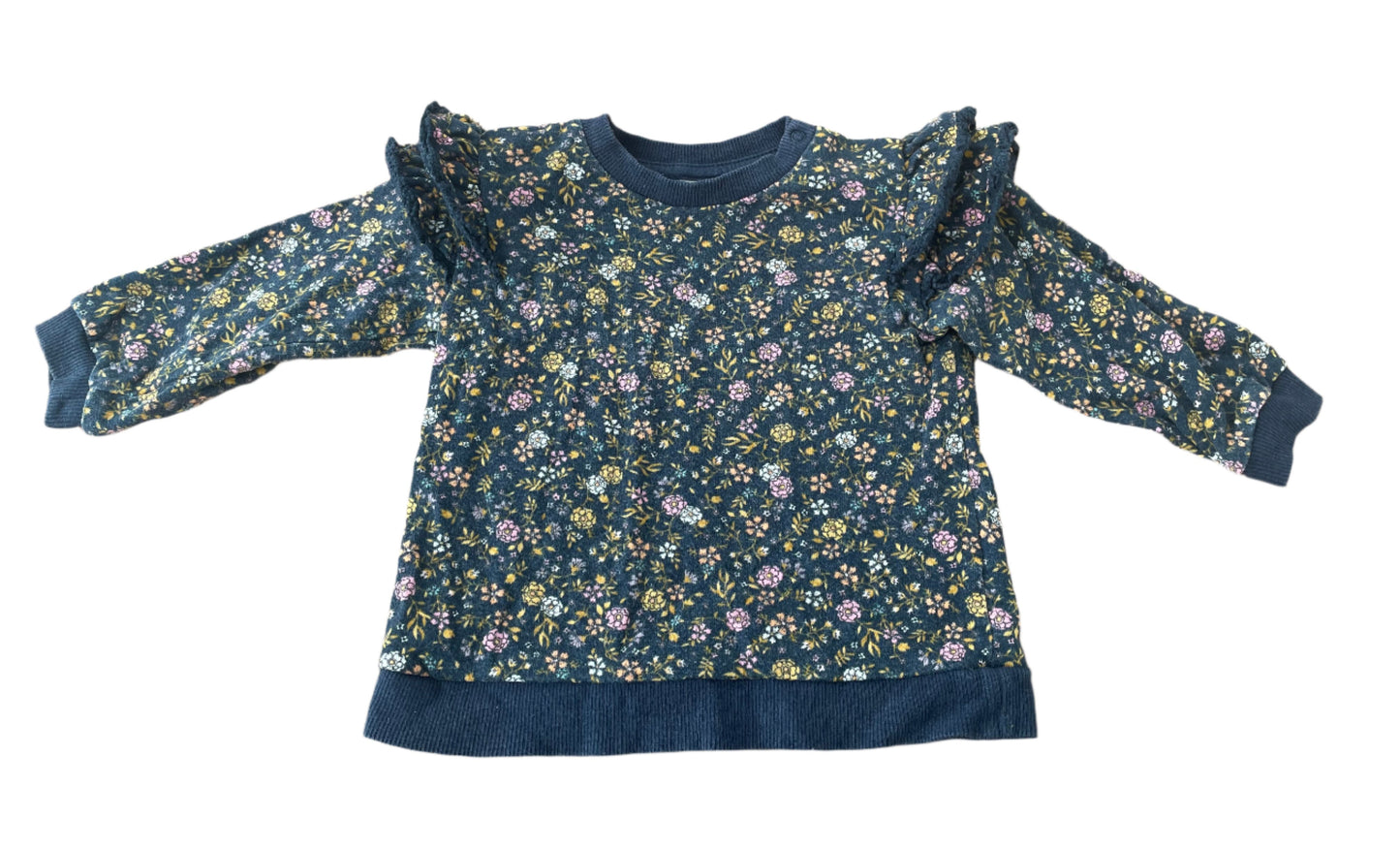 Twee lange mouwen truien met een ruche op de schouders. De truien hebben twee drukknopen op de rechterschouder. Maat 80, 9 - 12 maanden 100% katoen van H&M