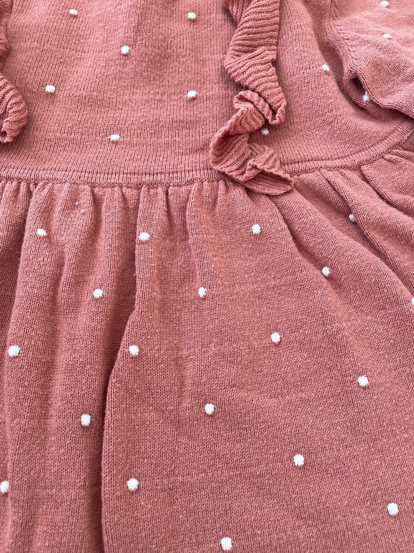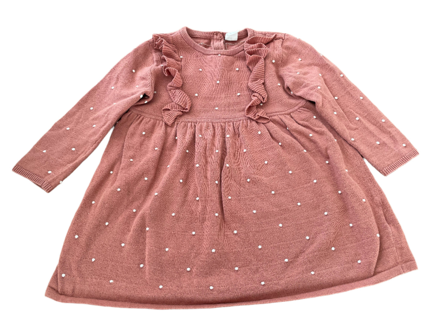 Fijngebreide jurk van zacht, hoogwaardig katoen met een uitlopende rok. Ronde, geribbelde halslijn, opening aan de achterkant met corozoknopen en ruches aan de voorkant. Lange mouwen met geribbelde manchetten. De jurk is donkerroze, maat 86, 12 - 18 maanden 100% katoen van H&M