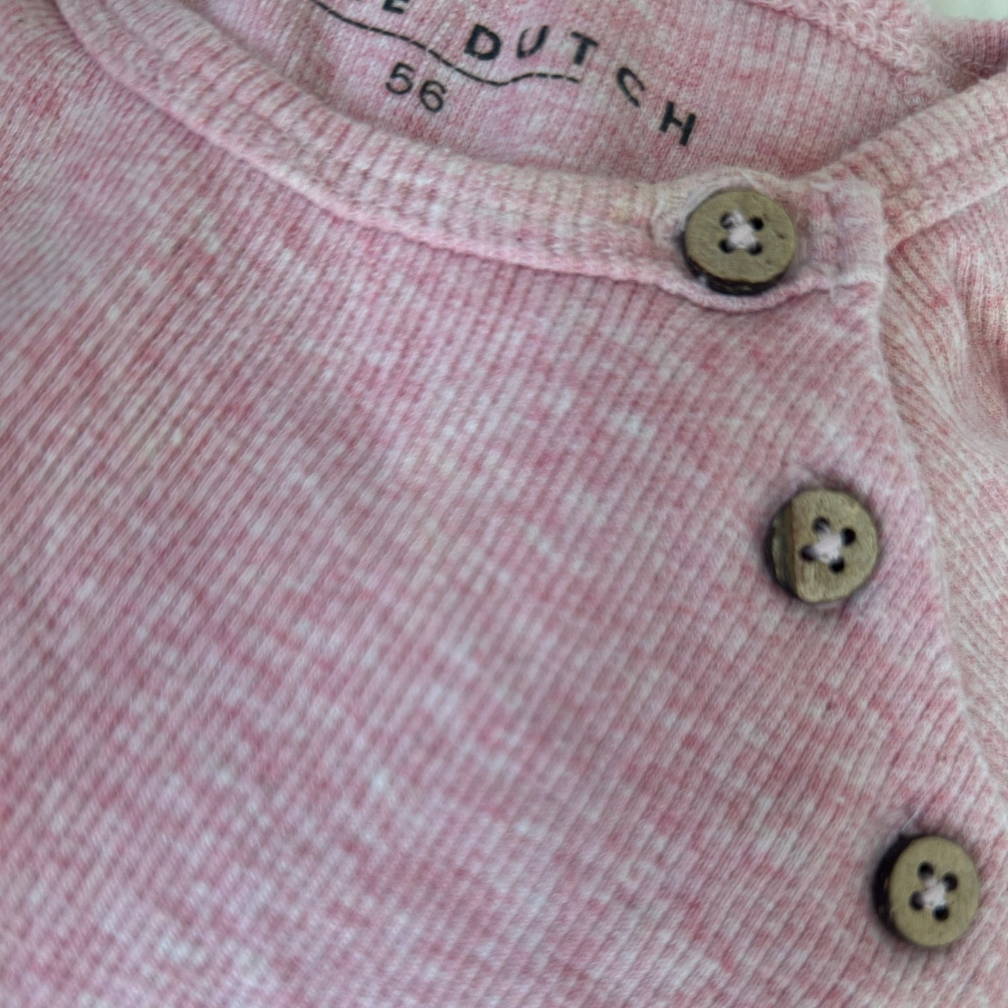 Onesie met lange mouwen, knopen aan de voorkant aan de rechterkant en drukknopen aan de binnenkant van de benen voor eenvoudig aan- en uitkleden en verschonen van de luier. Maat 56, 1 - 2 maanden 95% katoen 5% elastaan van Little Dutch