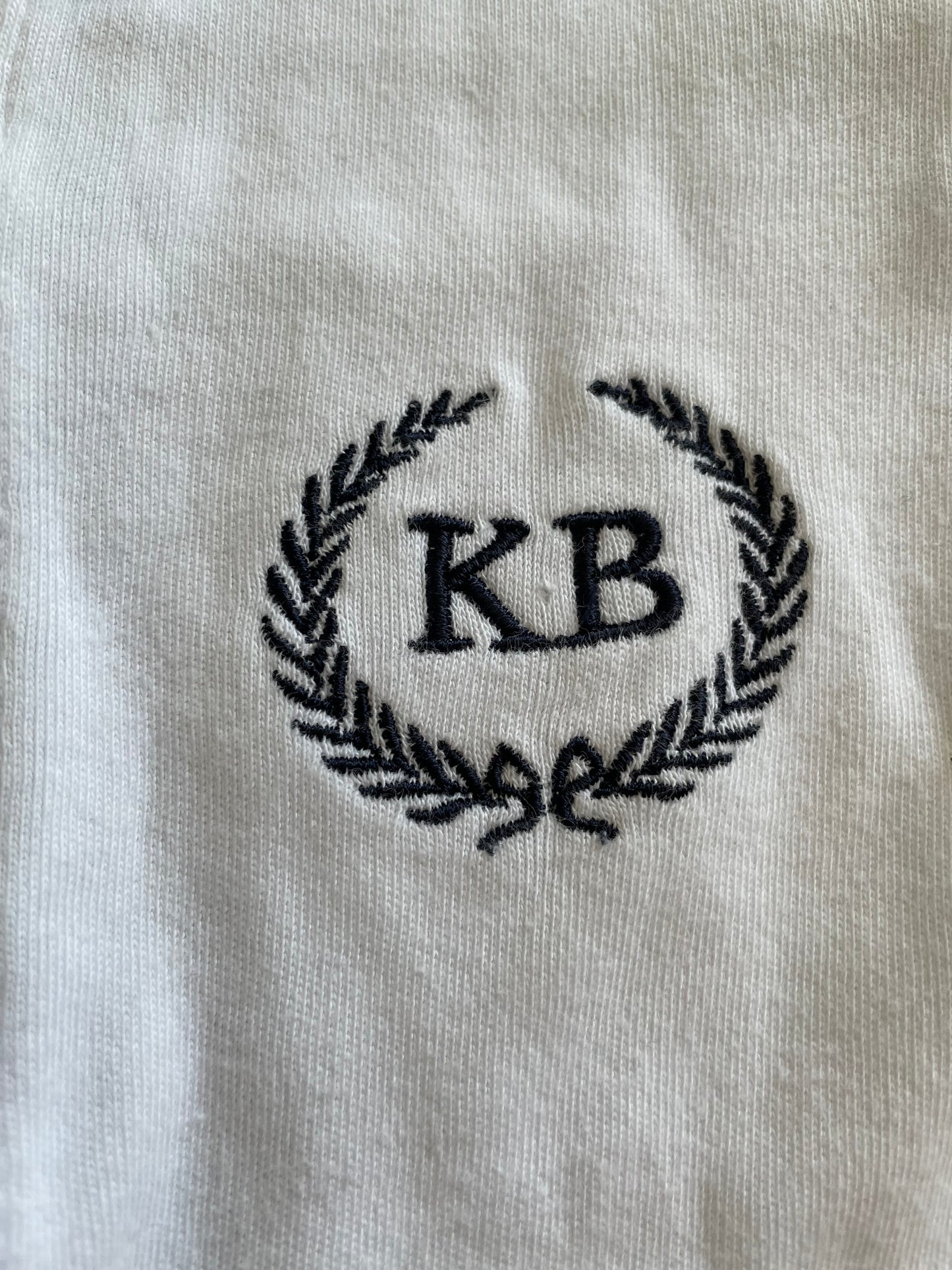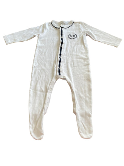 Witte popper front interlock babygrow met marineblauw logo lint popperstand en marineblauw monogram borduurwerk. Onesie met lange mouwen en drukknopen langs de voorkant en de binnenkant van de benen voor gemakkelijk aan- en uitkleden en verschonen van de luier. Maat 74-80, 6 - 12 maanden van Koco Bino (Zuid-Afrikaans merk)