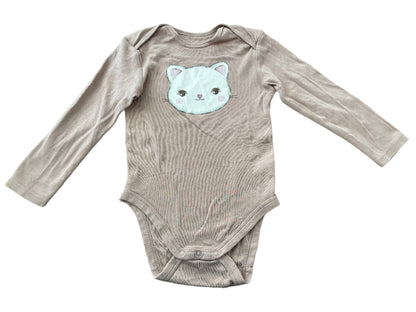 Lichtbruine romper met lange mouwen, kattenprint, envelophals en drukknopen aan de onderkant. Maat 92 (18 - 24 maanden) 100% katoen van C&A