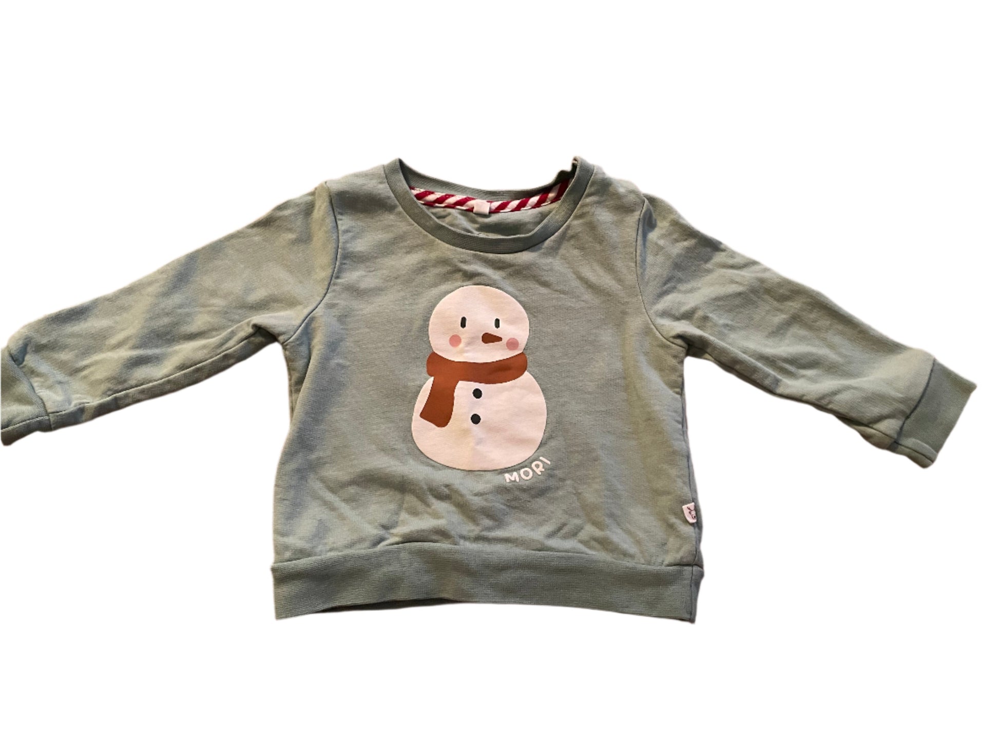 Leuke sneeuwman trui voor de feestdagen. Deze groene trui heeft 2 drukknopen op de rechterschouder voor makkelijk aan- en uitkleden. Maat 80, 9 - 12 maanden van Mori