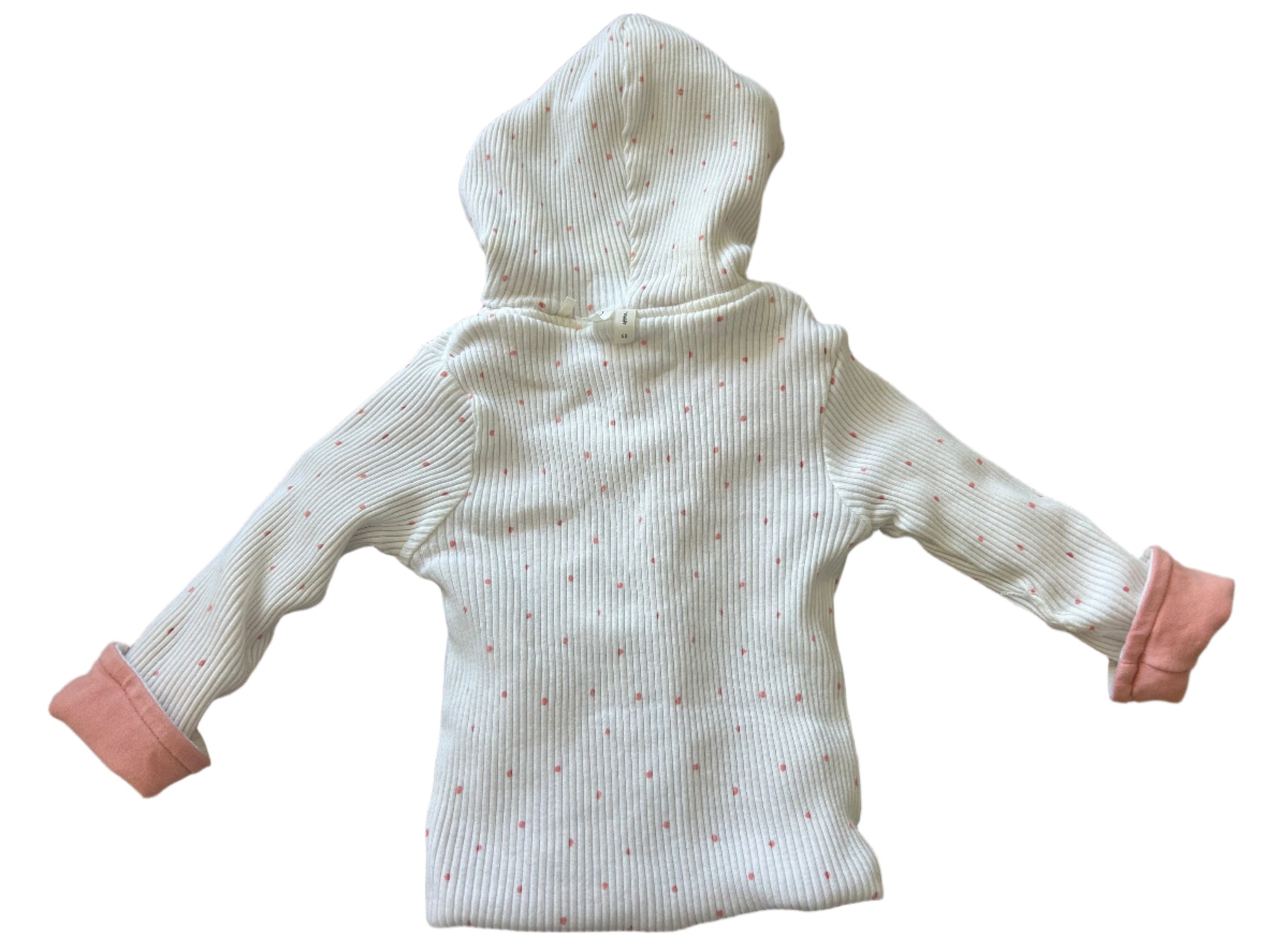 Reversible jacket with press studs on the front and a hood. The jacket is peach on one side and the other is white with peach dots. Size 68, 4 to 6 months from Bess 95% Organic Cotton 5% Elastane