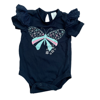 Navy romper met vlinderprint en ruches op de schouders. De romper heeft een knoopje op de rug voor makkelijk aan- en uitkleden. Maat 62 - 68 (3 - 6 maanden) 60% Katoen 40% Polyester van Clicks