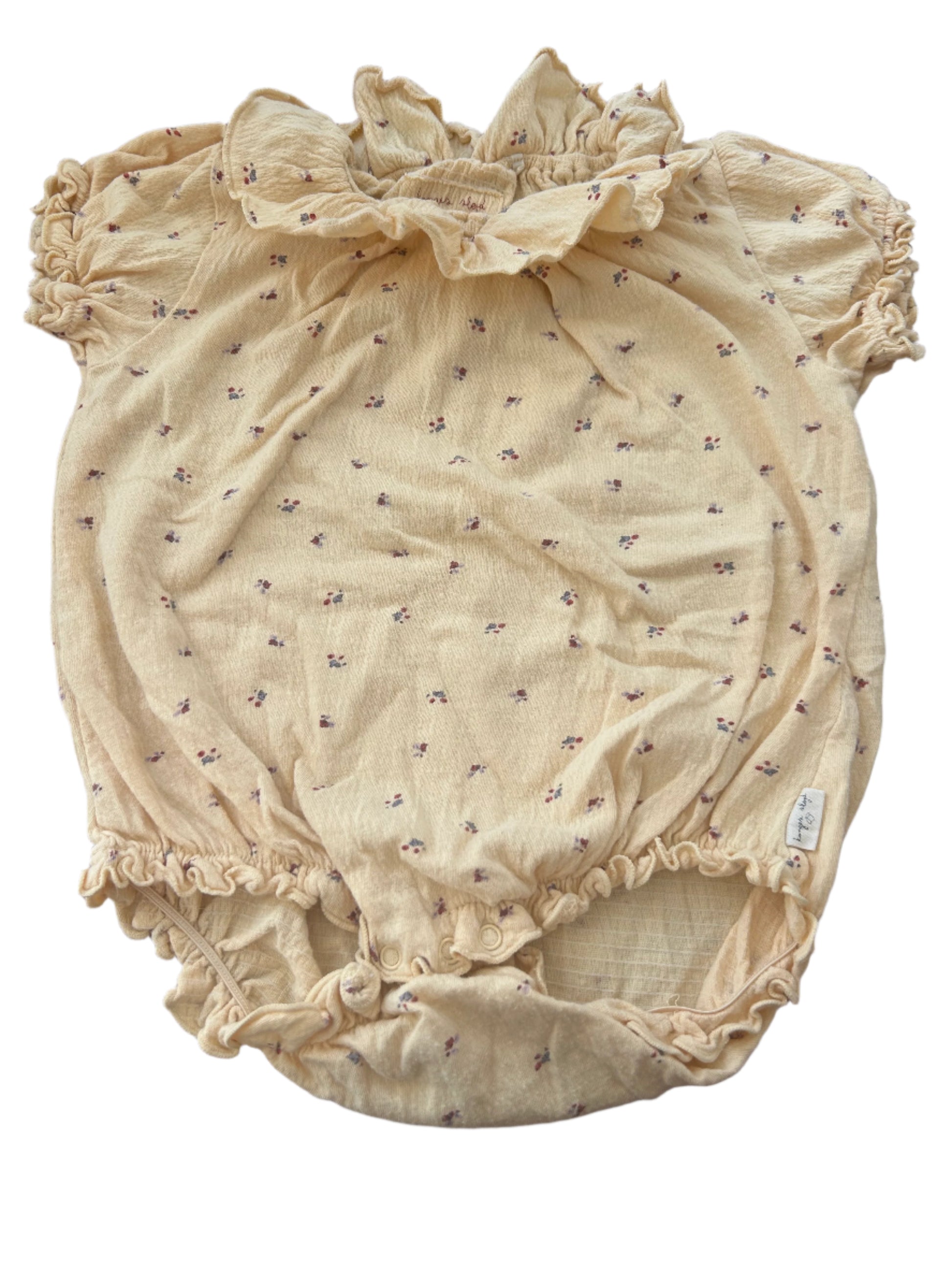 Yellow short-sleeve romper (onesie) with frill around the neck and elasticated cuffs. The romper has 3 press studs and has two worn holes at the press studs due to use. Size 80, 9 to 12 months from Konges Slojd 96% Cotton 4% Elastane