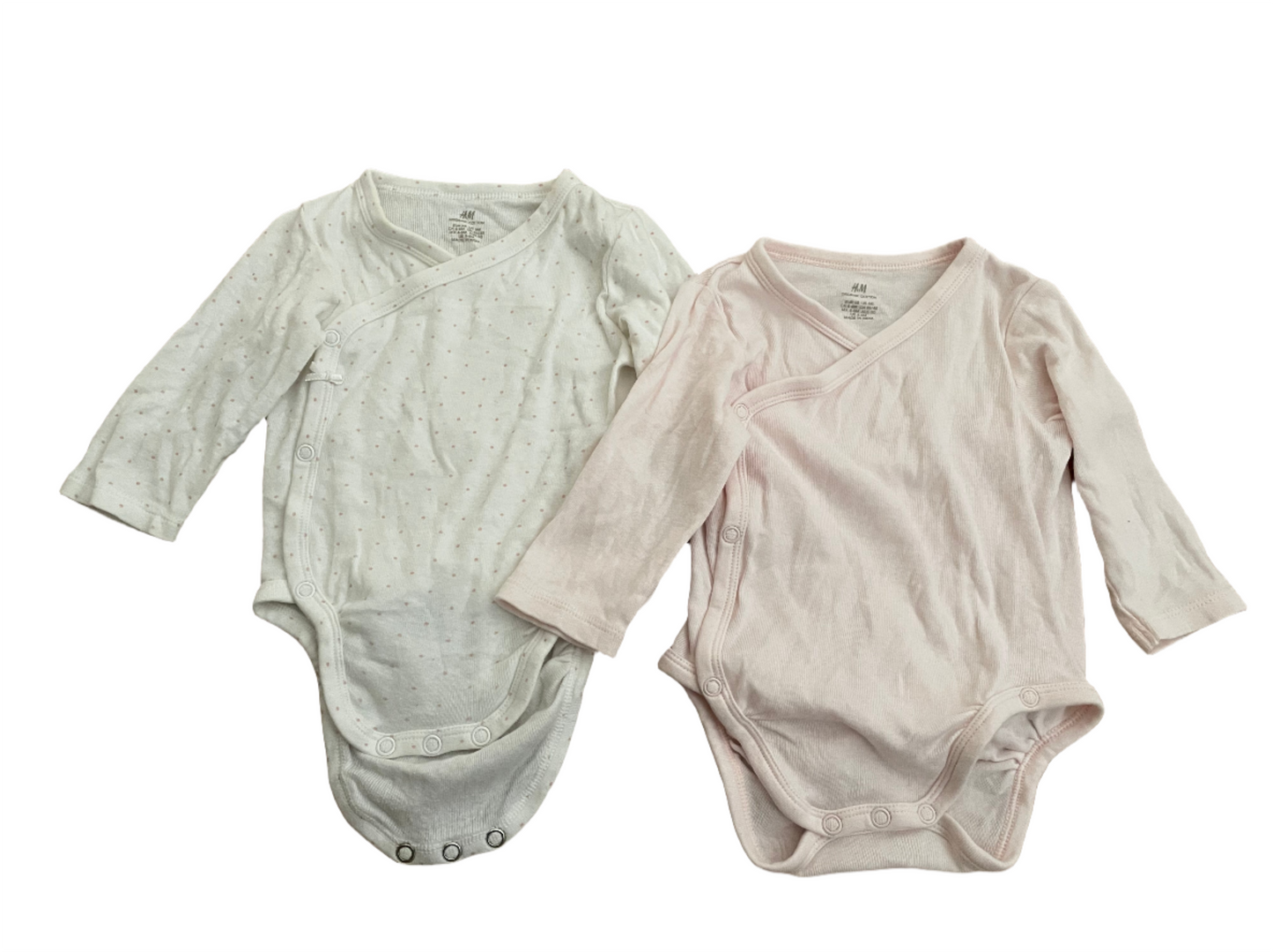 Set van twee rompertjes met lange mouwen, een wit met roze stippen en de andere lichtroze. De rompertjes hebben drukknopen aan de zijkant voor gemakkelijk aan- en uitkleden. Maat 68 (4 - 6 maanden) 100% katoen van H&M