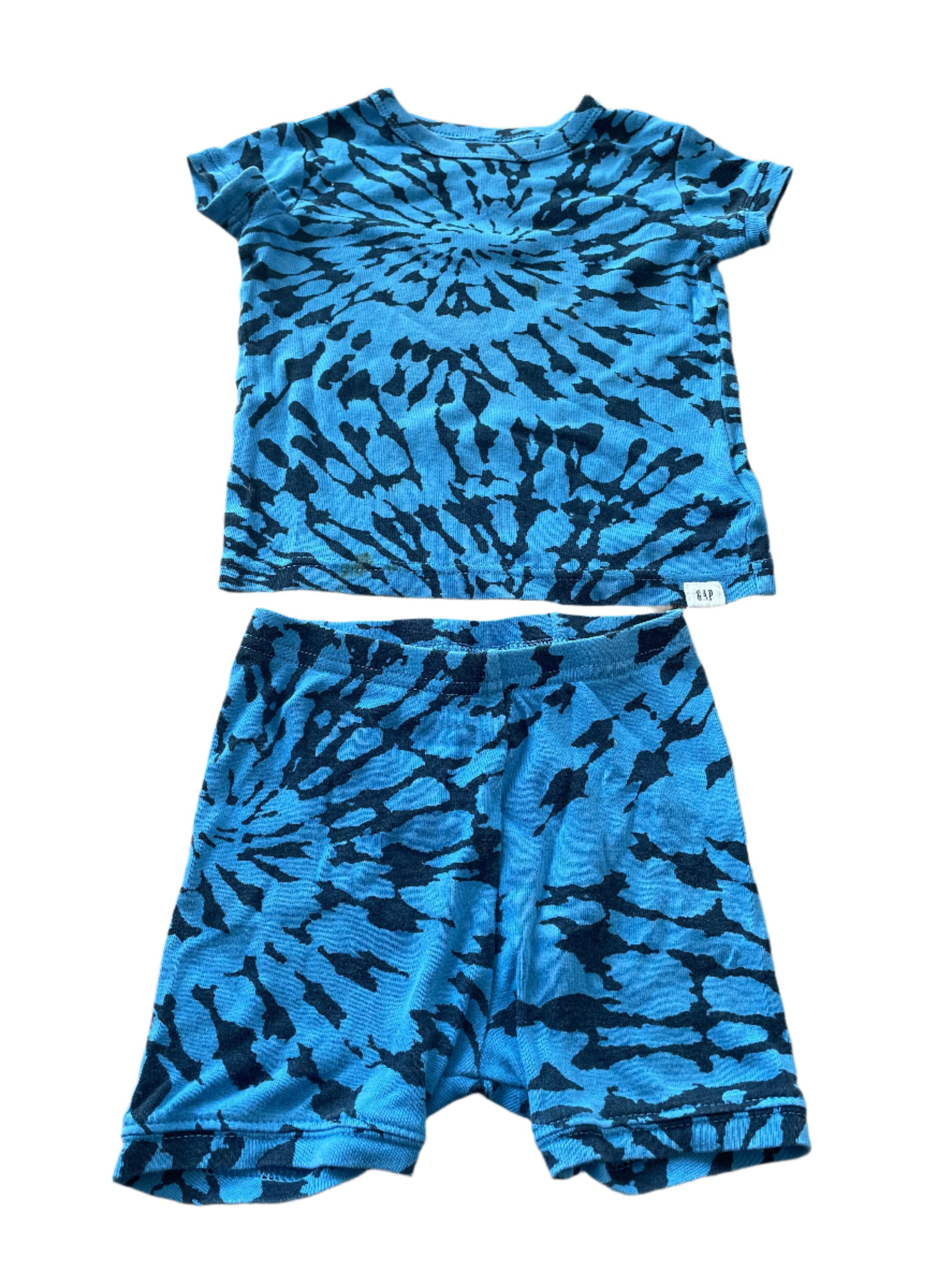Blauwe pyjamaset bestaande uit shirt en short, maat 92, 2 jaar, van GAP Baby, 100% biologisch katoen. Het shirt heeft twee kleine vlekjes op de voorkant.
