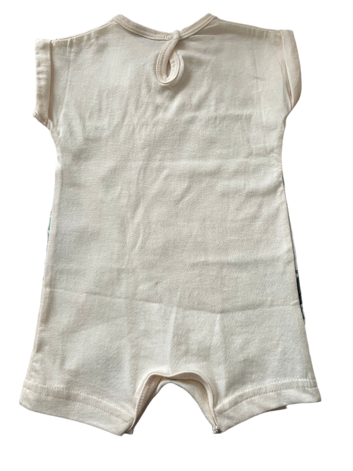 Schattige crèmekleurige speelset met korte mouwen en jungleprint. De speelset heeft een drukknoop aan de achterkant en tussen de benen voor gemakkelijk aan- en uitkleden. Deze speelset is gloednieuw. Maat 50 - 60. 0 tot 3 maanden vanaf PnP Tiny Tots 100% katoen
