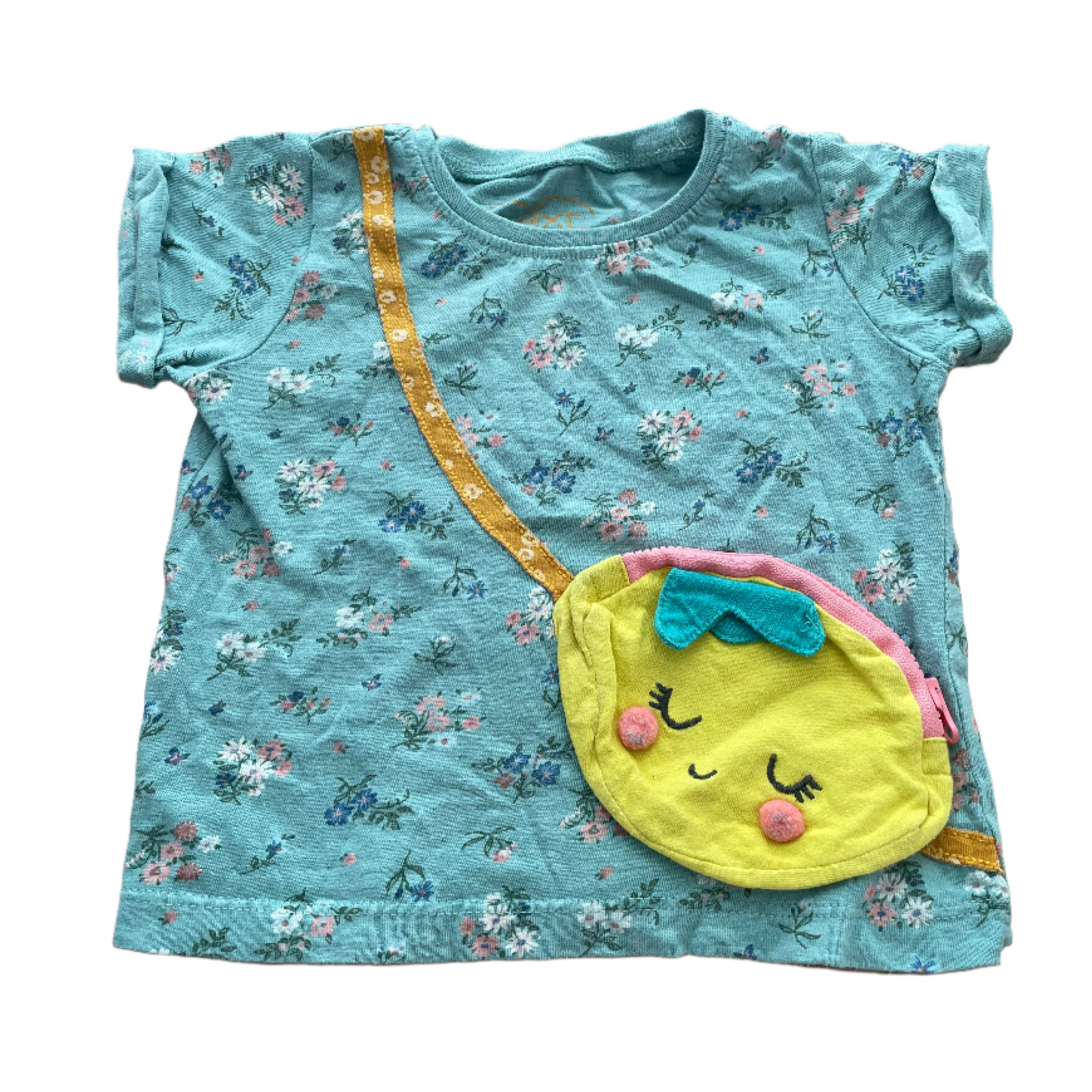 Groen t-shirt met korte mouwen, bloemenprint en een gele portemonnee rechtsonder. Maat 74 (6 - 9 maanden) 100% katoen van Next