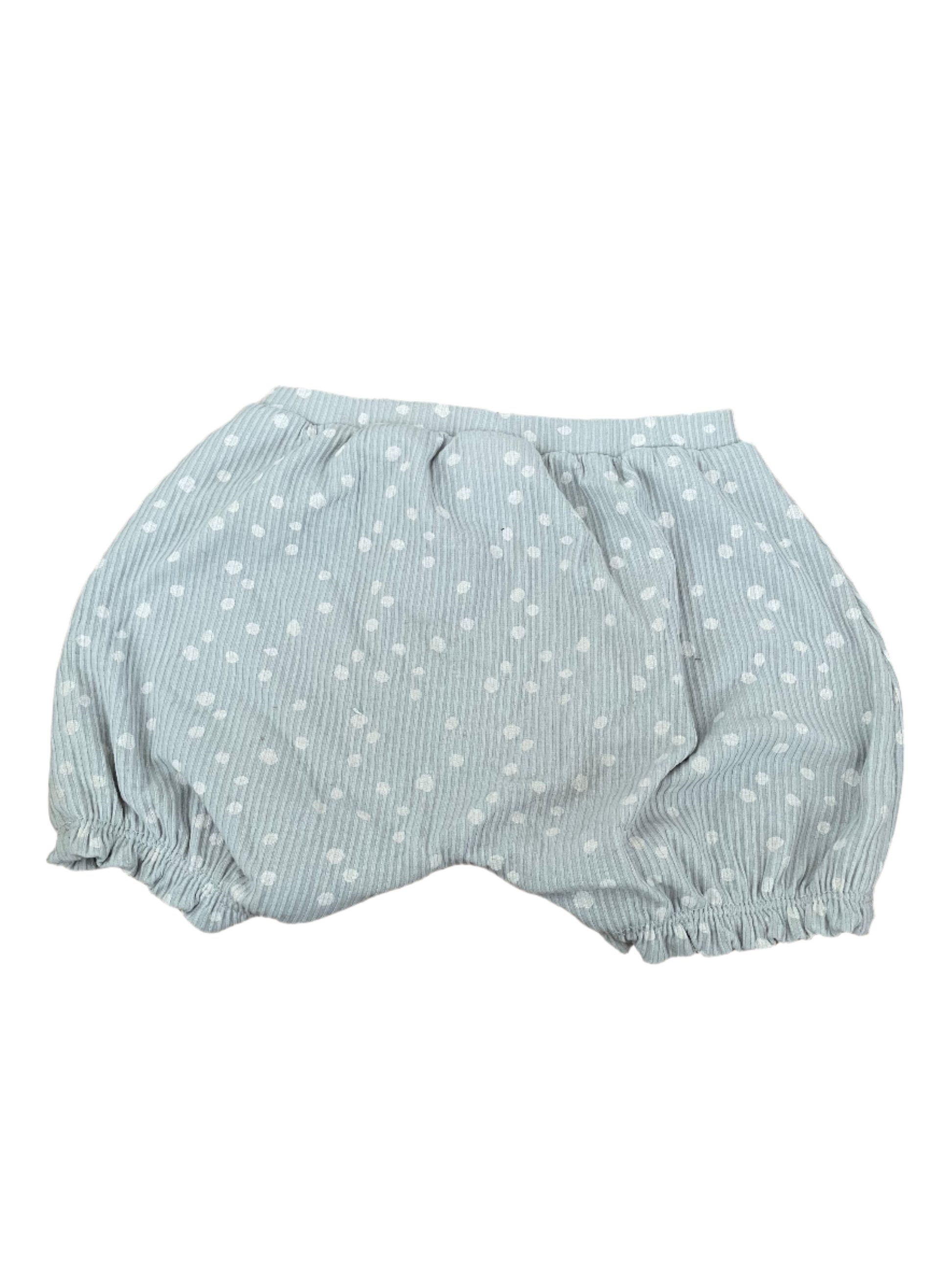 Short van grijs geribbeld materiaal met witte stippen. De short heeft twee knoopjes aan de voorkant, een elastische taille en elastiek rond de pijpen. Heeft een lichte vlek op het rechterbeen. Maat 80 (9 - 12 maanden) 63% Polyester 34% Katoen 3% Elastaan van Next baby