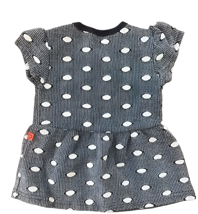 Navy summer dress with white polka dots and an inspiring message in pink. The dress has two press studs on the right shoulder for easy dressing and undressing. Size 74, 6 to 9 months from Dirkje. 95% Cotton 5% Elastane