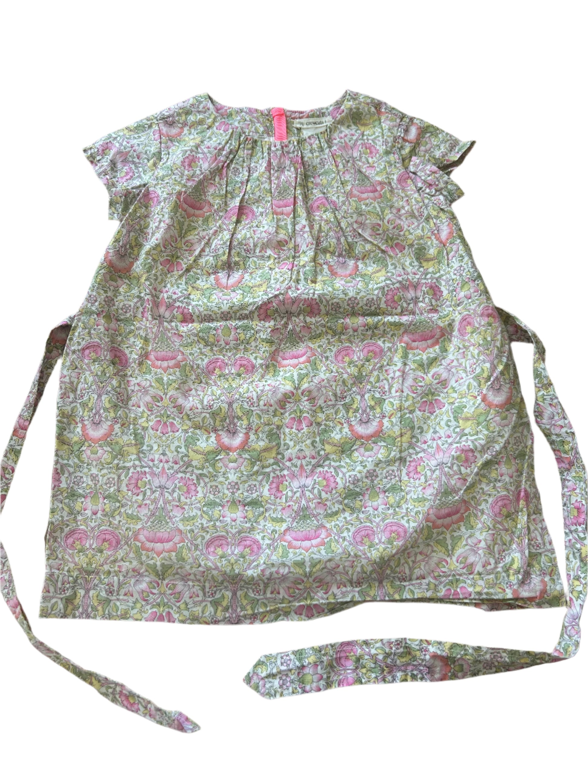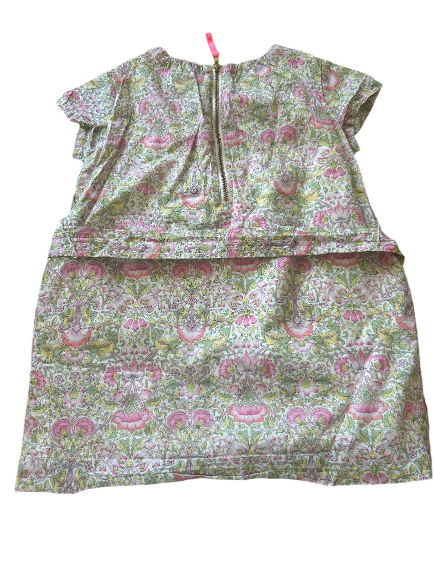 Pink and green flower print dress with a belt around the waist. The dress has a zipper at the back for easy dressing and undressing. The belt can be removed for a different style. Size 92, 2 years from Crewcuts. 100% Cotton