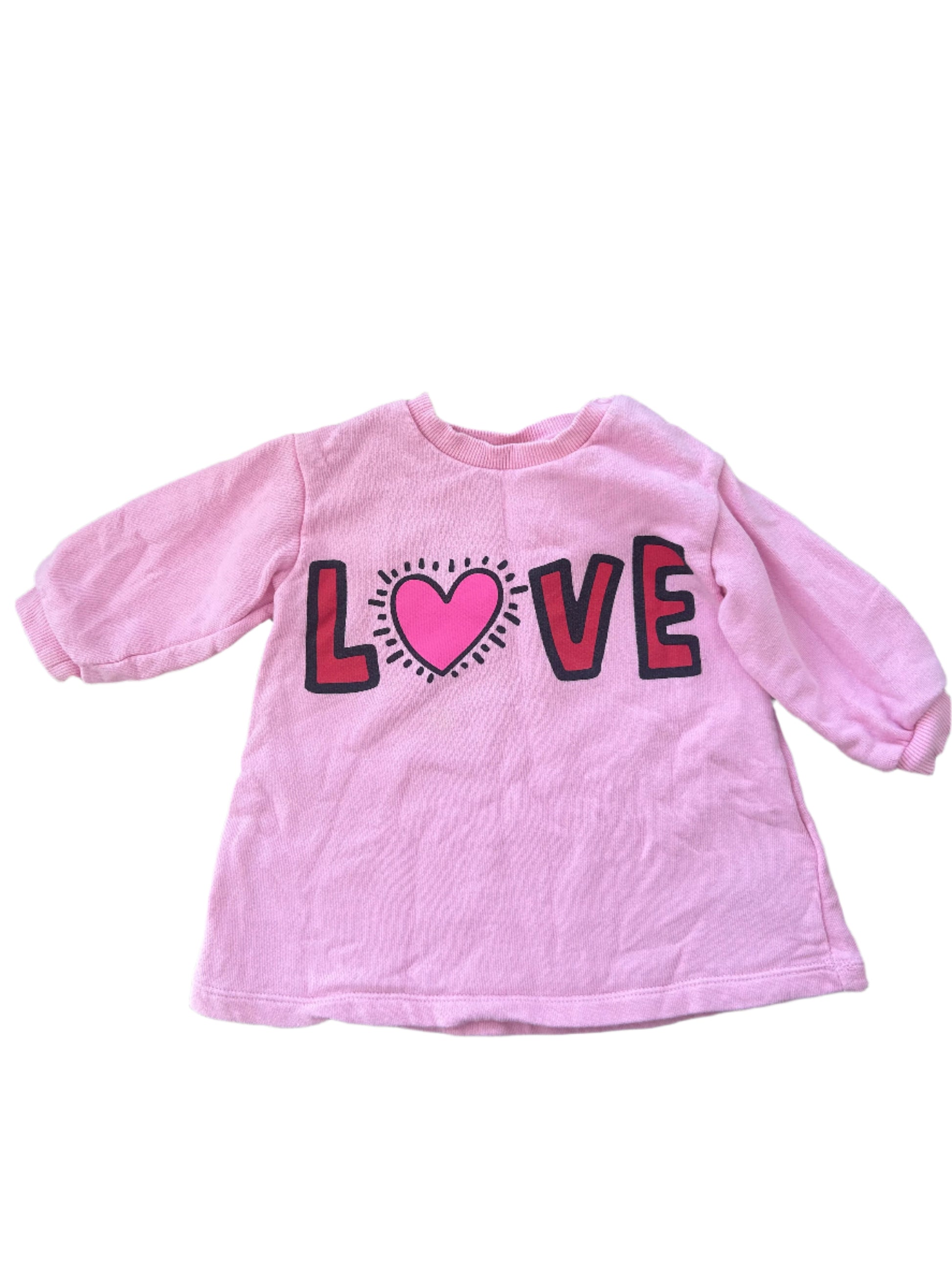 Pink love sweater with 2 press studs on the right shoulder for easy dressing and undressing. The sweater has ribbed cuffs and a barely visible stain on the front. Size 68, 4 to 6 months from H&M 100% Cotton
