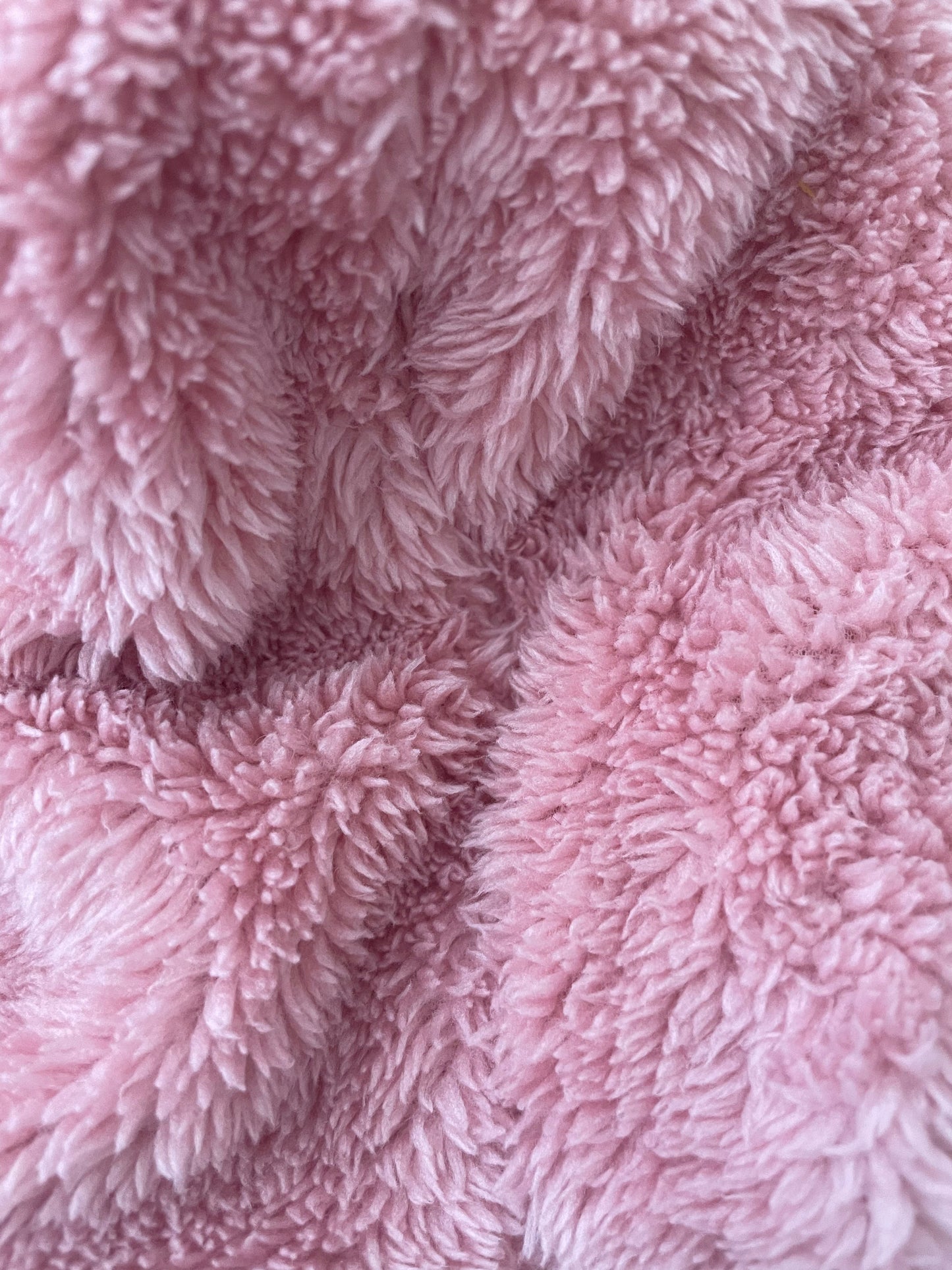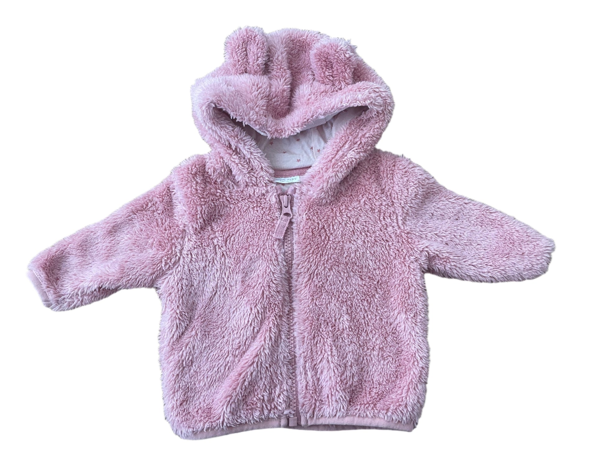 Roze Teddy jas met oortjes op de capuchon en rits aan de voorkant. Maat 62-68, 3 tot 6 maanden. 100% Polyester buitenkant, 100% katoenen voering van Next babies