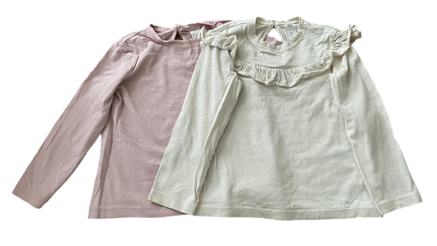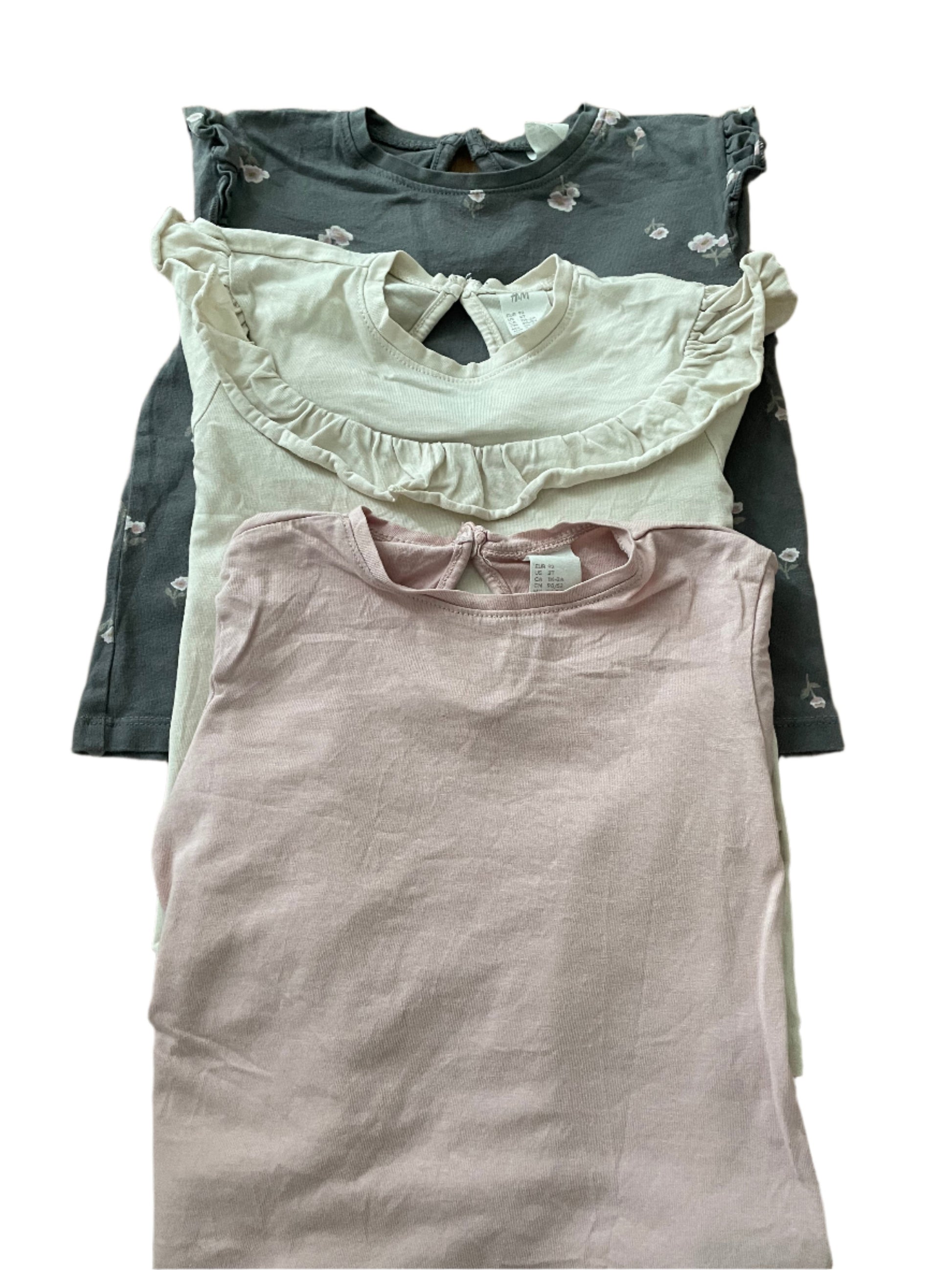 Drie shirts met lange mouwen, alle drie met een knoopje aan de achterkant voor makkelijk aan- en uitkleden. Eén shirt is off white met een ruche aan de voorkant, één is vuilroze en de andere is grijs met bloemenmotief en ruches op beide schouders. Maat 92, 18 - 24 maanden 100% katoen van H&M