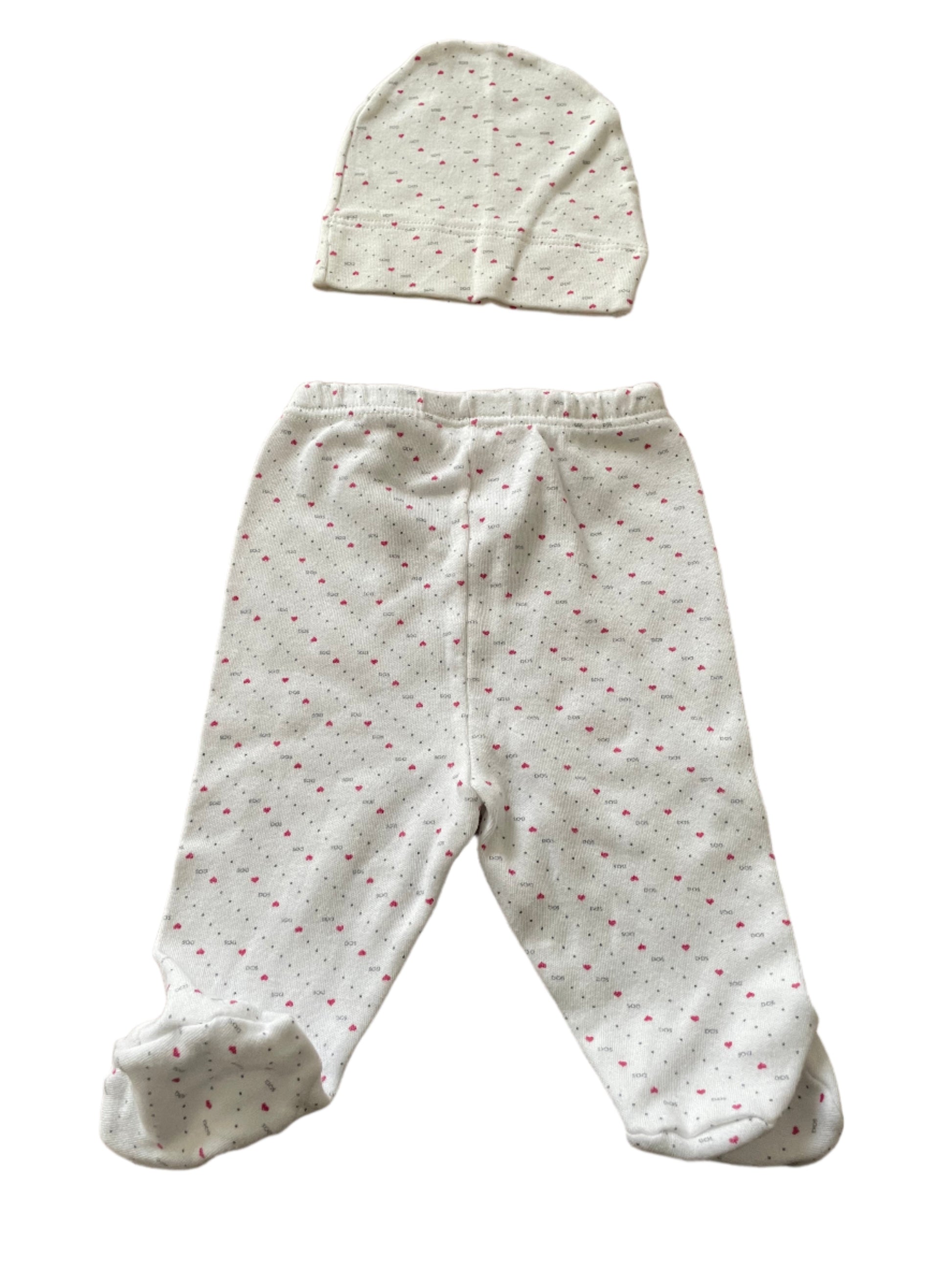 Superzachte newborn broek en muts, perfect voor je eerste reis naar huis. De broek heeft volle voeten met elastische hielen. Maat Newborn