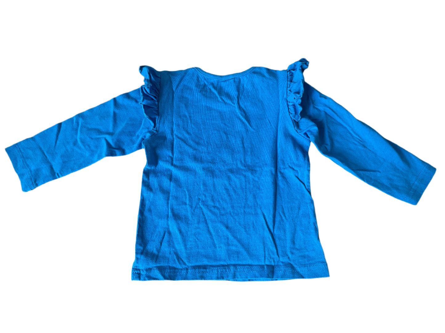 Twee shirts met lange mouwen, een blauwe en de andere groene. Beide shirts hebben een ruche op de schouders. Maat 86, 12 - 18 maanden, 100% katoen van Ackermans Baby