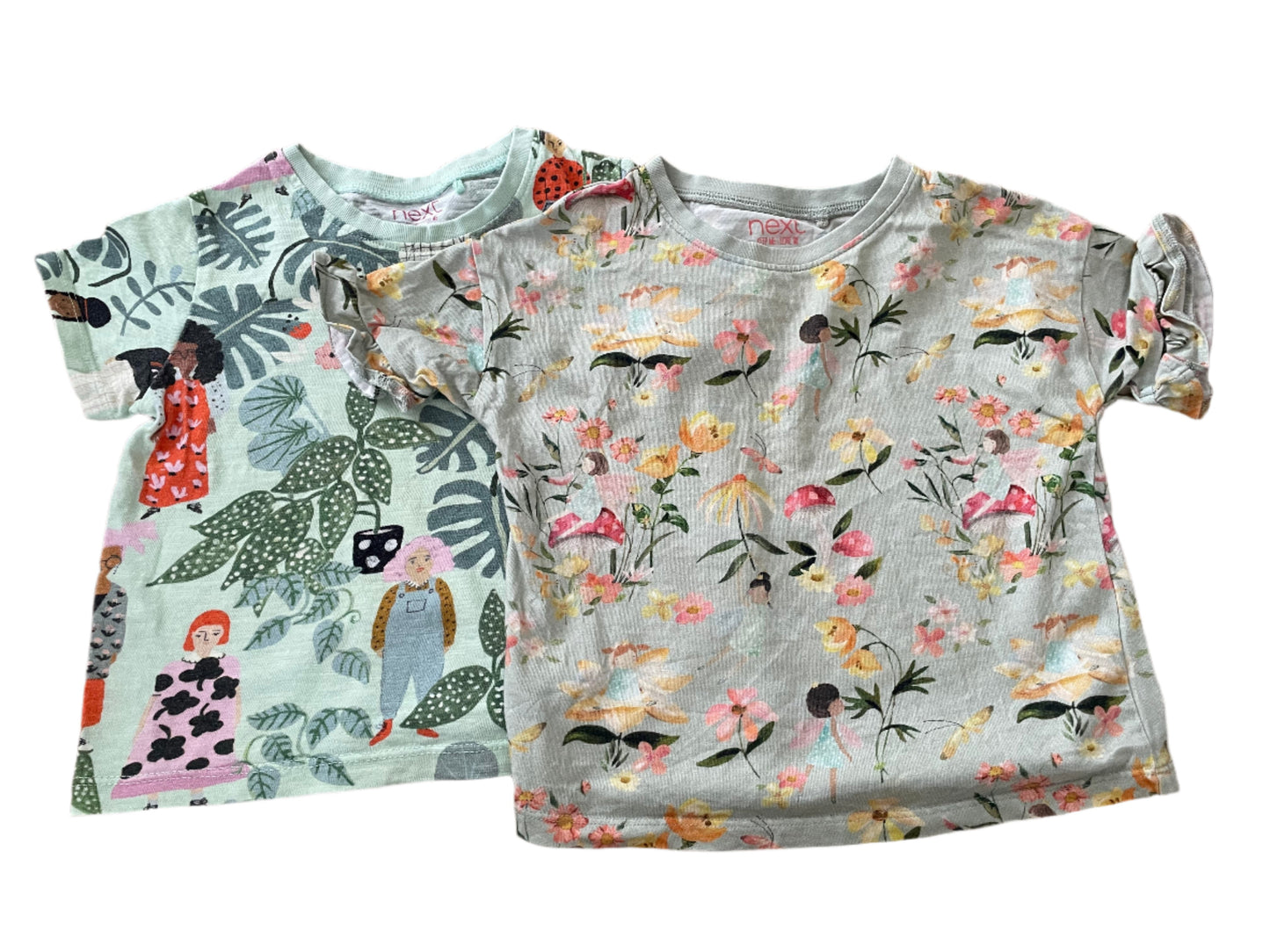 Twee T-shirts met korte mouwen, één T-shirt heeft twee ruches op de mouwen. Maat 92 (18 - 24 maanden) 100% katoen van Next babies