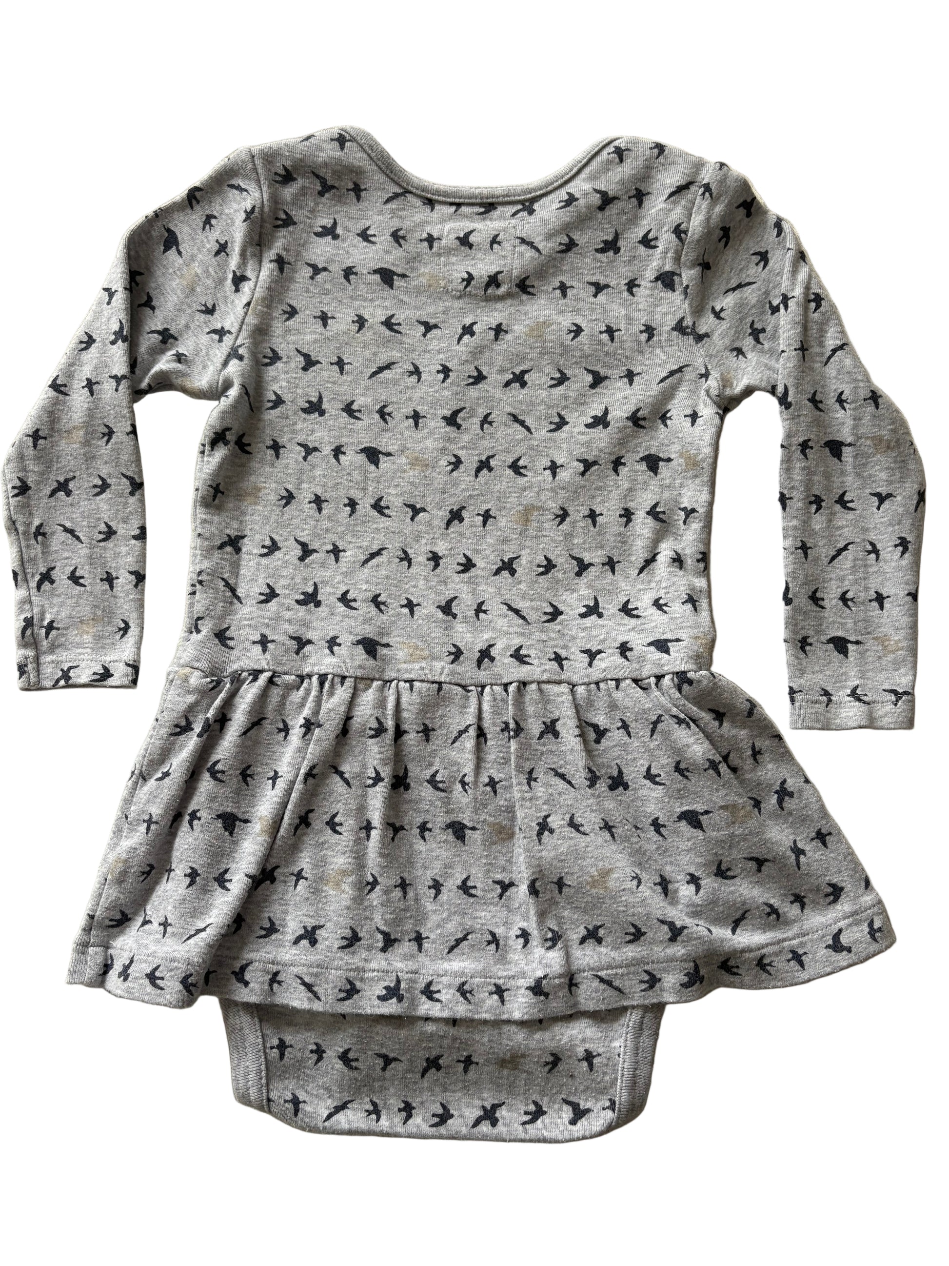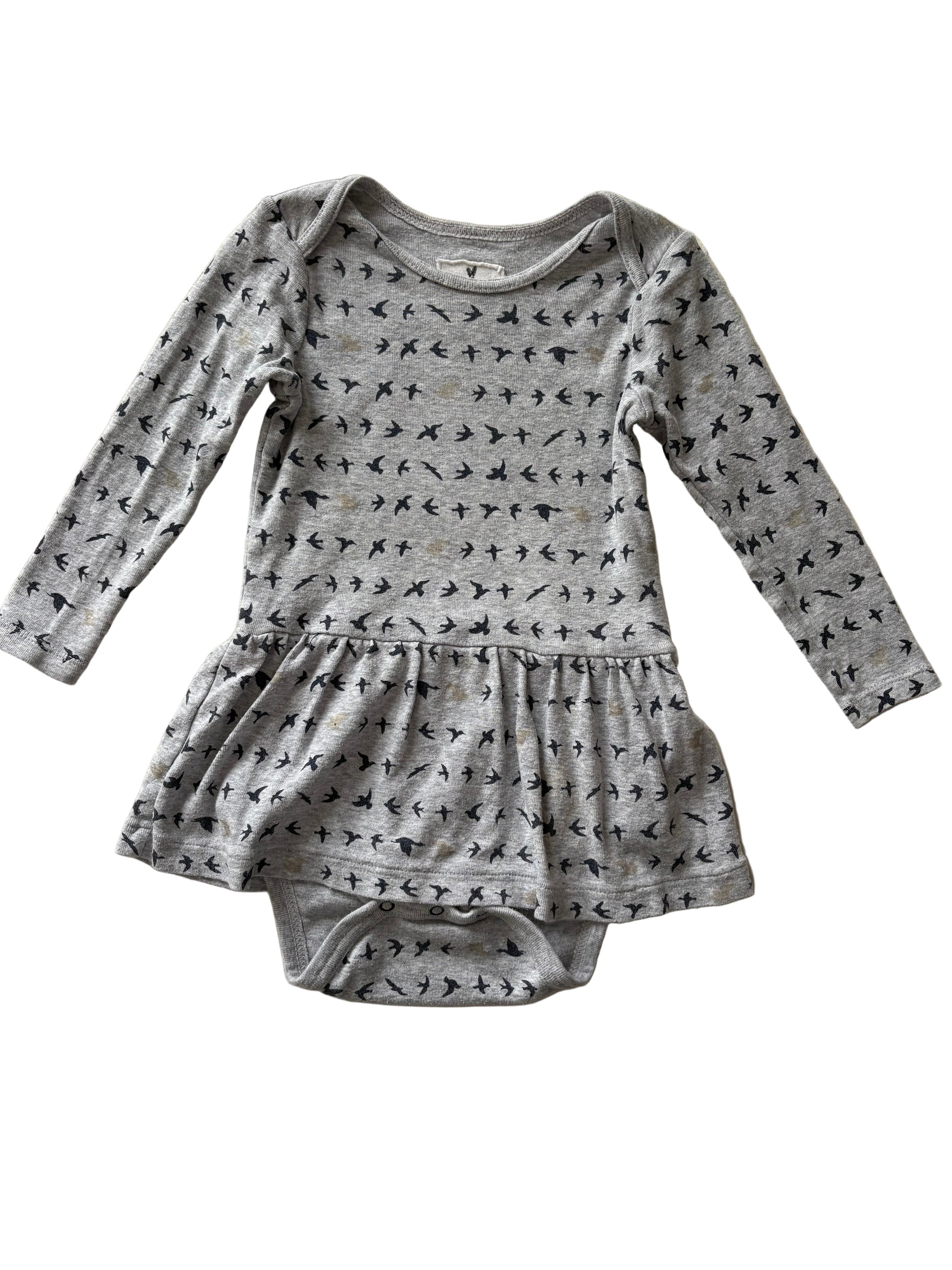 Grey dress with a built in romper/bodysuit. The dress has long sleeves with bird print and an envelope neck. Size 86, 12 to 18 months from J Crew
