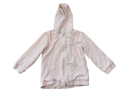 Jacket with pink and white stripes, the jacket has a zipper on the front and a hood. On the right sleeve at the back the jacket has a slight stain. Size 86 - 92, 1 to 2 years from Koeka 95% Cotton 5% Elastane