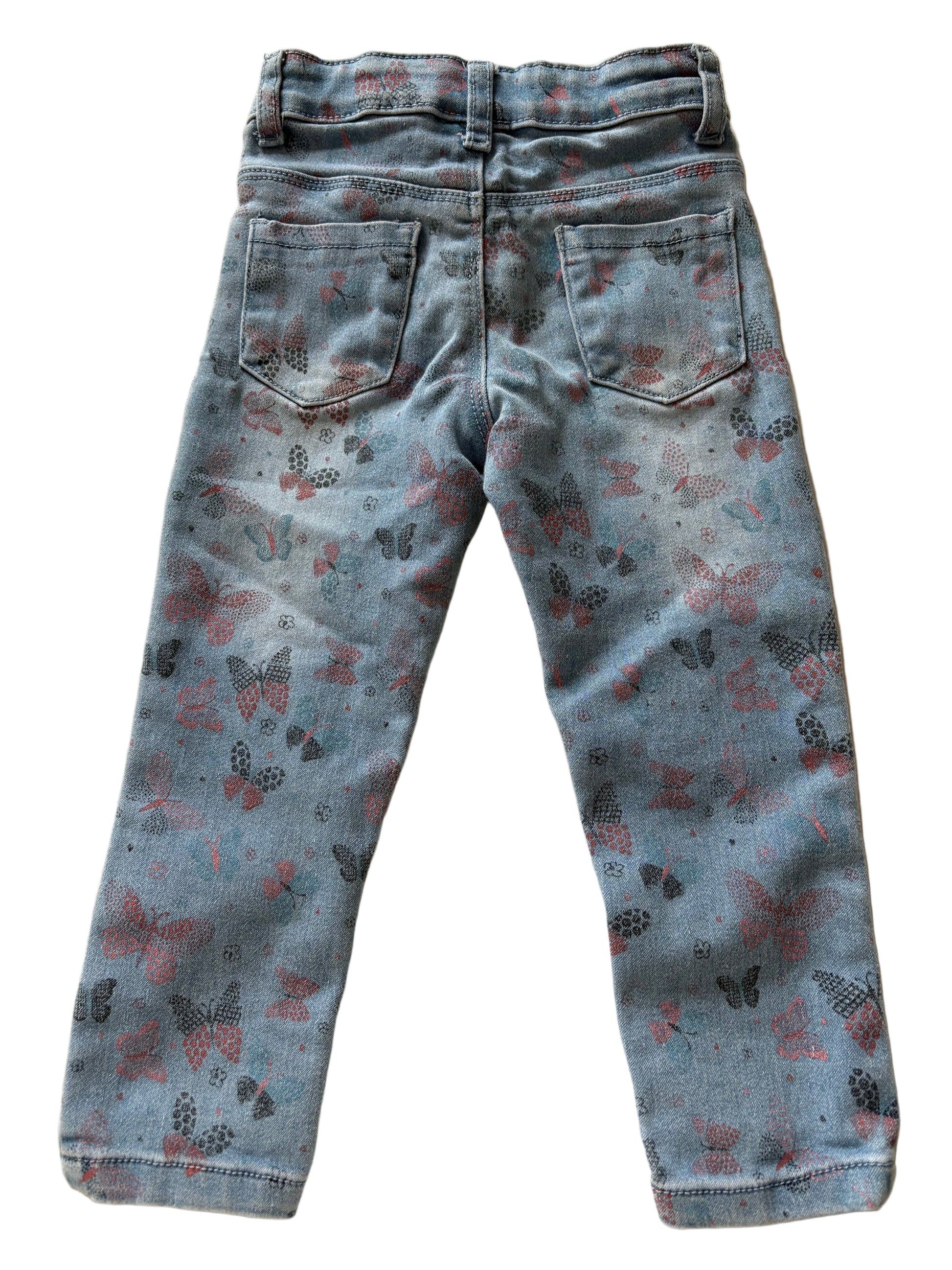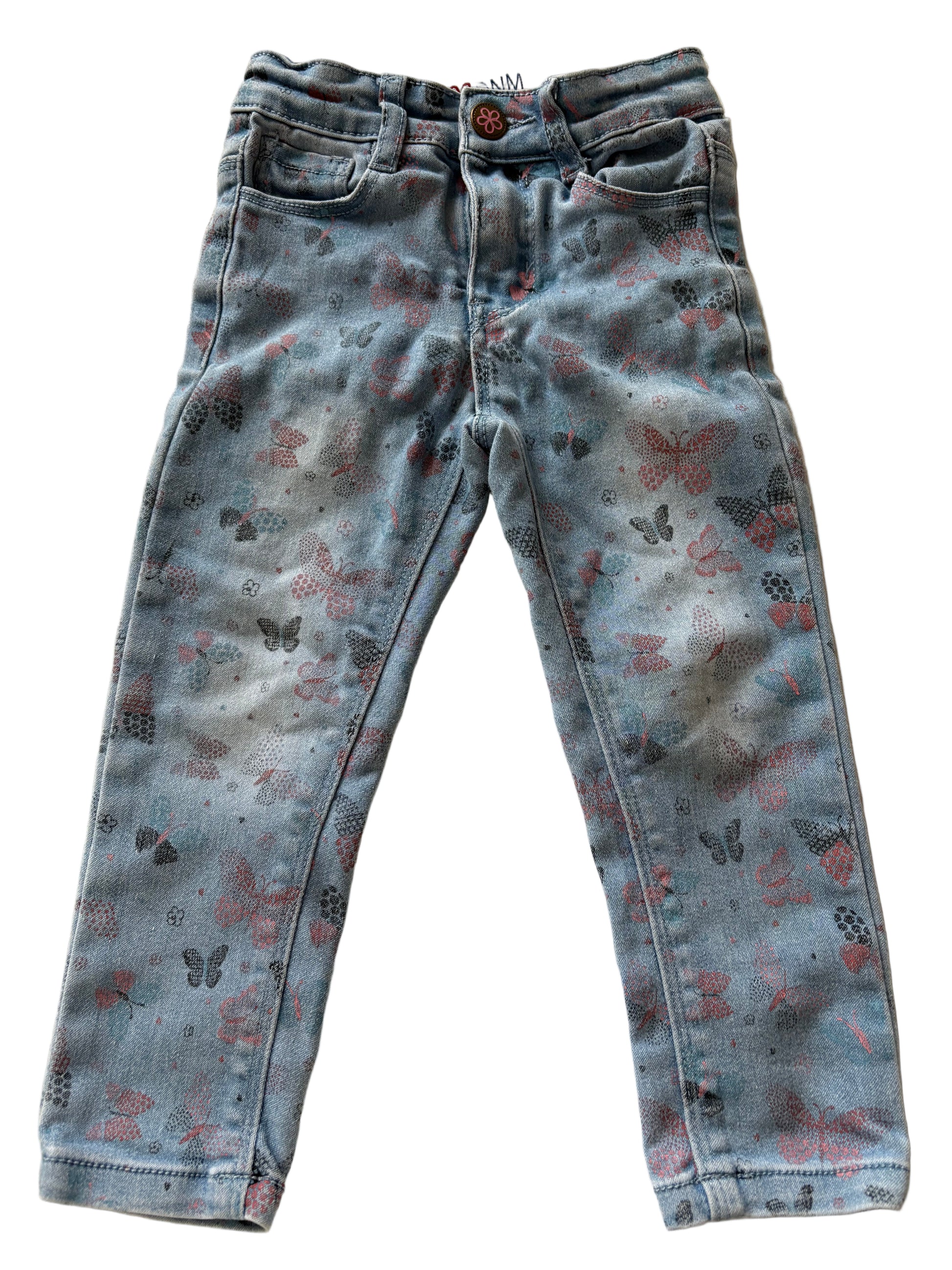 Blue jeans with pink and grey butterflies and 5 pockets. Size 92 to 98, 2 to 3 years from 1996 DNM 57.4% Cotton 26.3% Polyester 14.9% Viscose 1.4% Elastane
