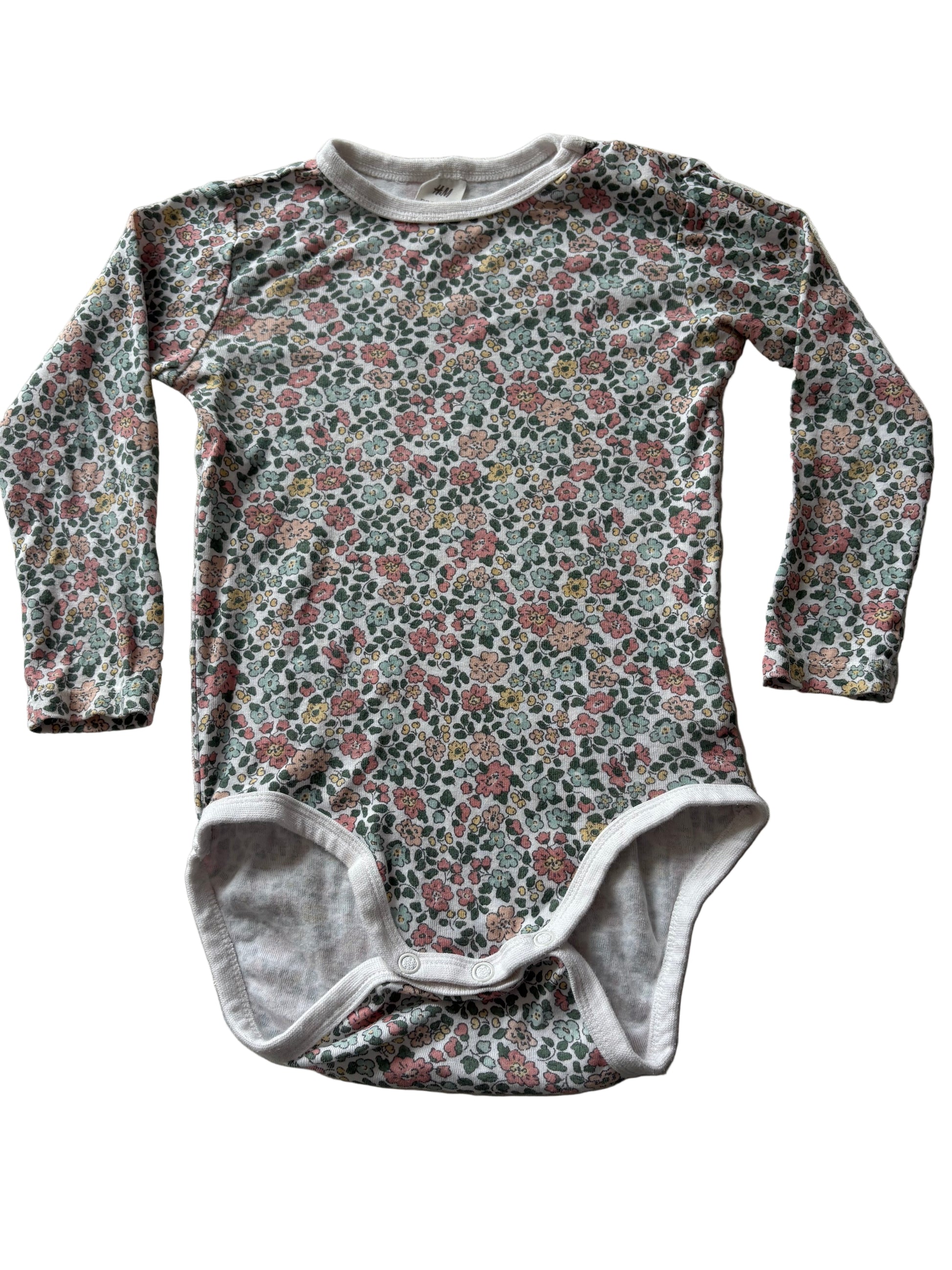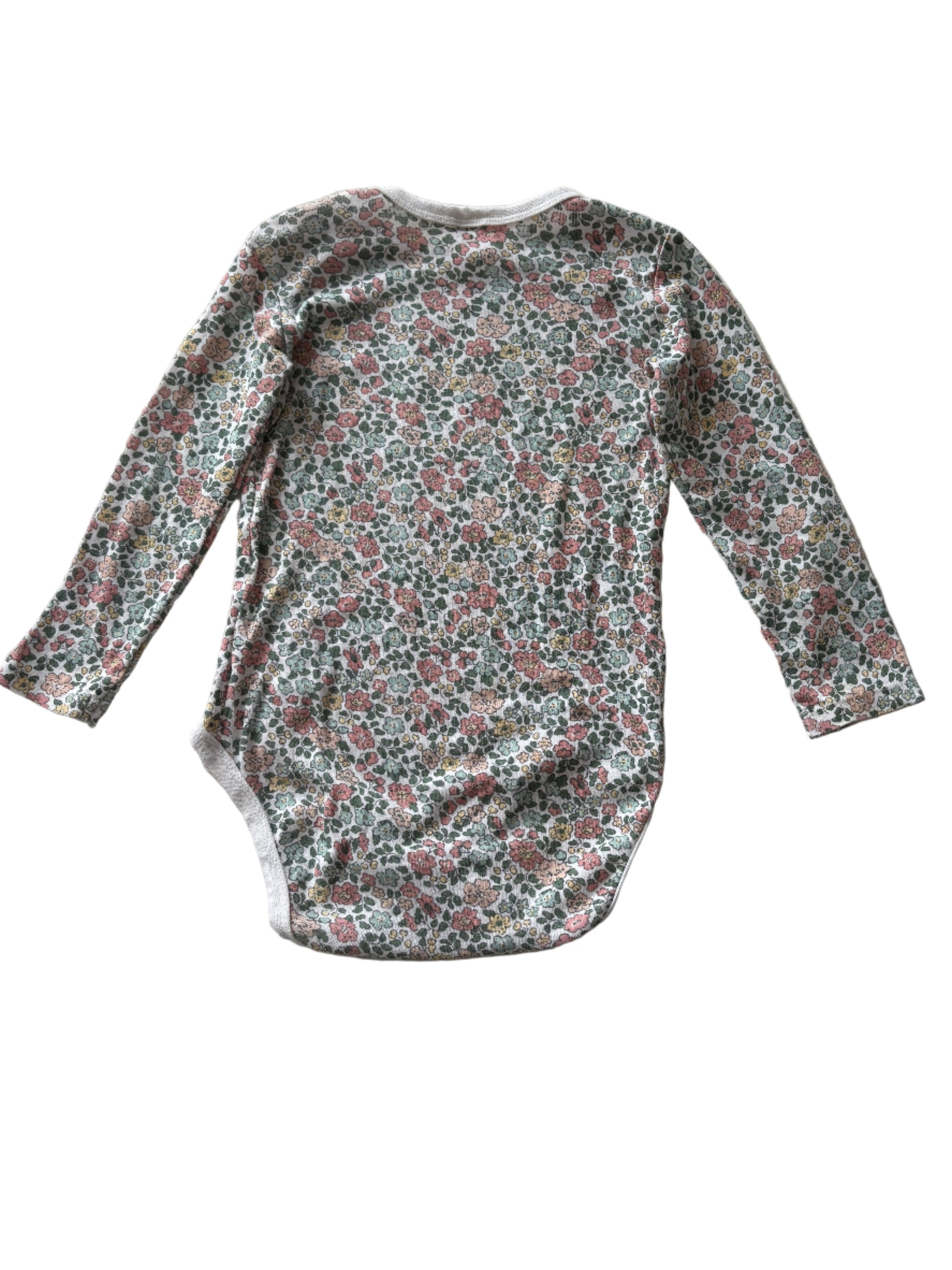 Floral long-sleeve romper with press stud on the right shoulder for easy dressing and undressing. Size 92, 18 to 24 months, 1.5 to 2 years from Hema 100% Cotton