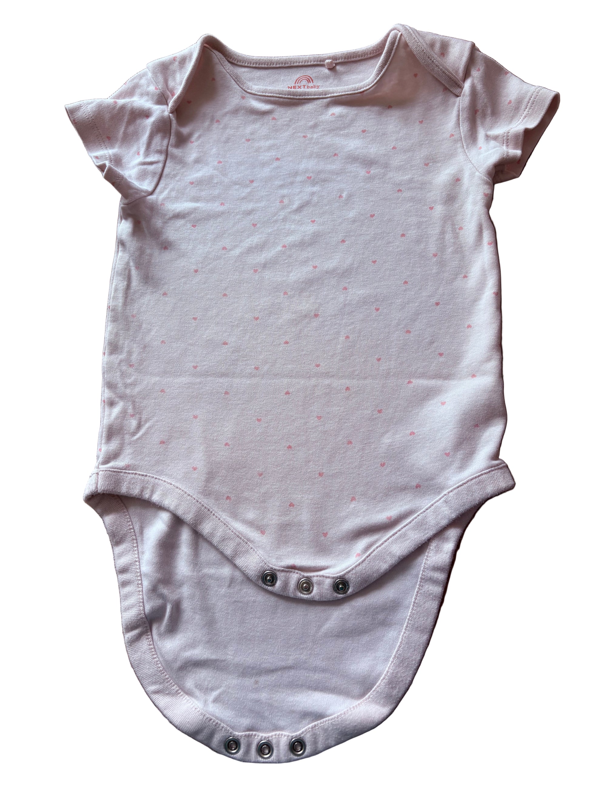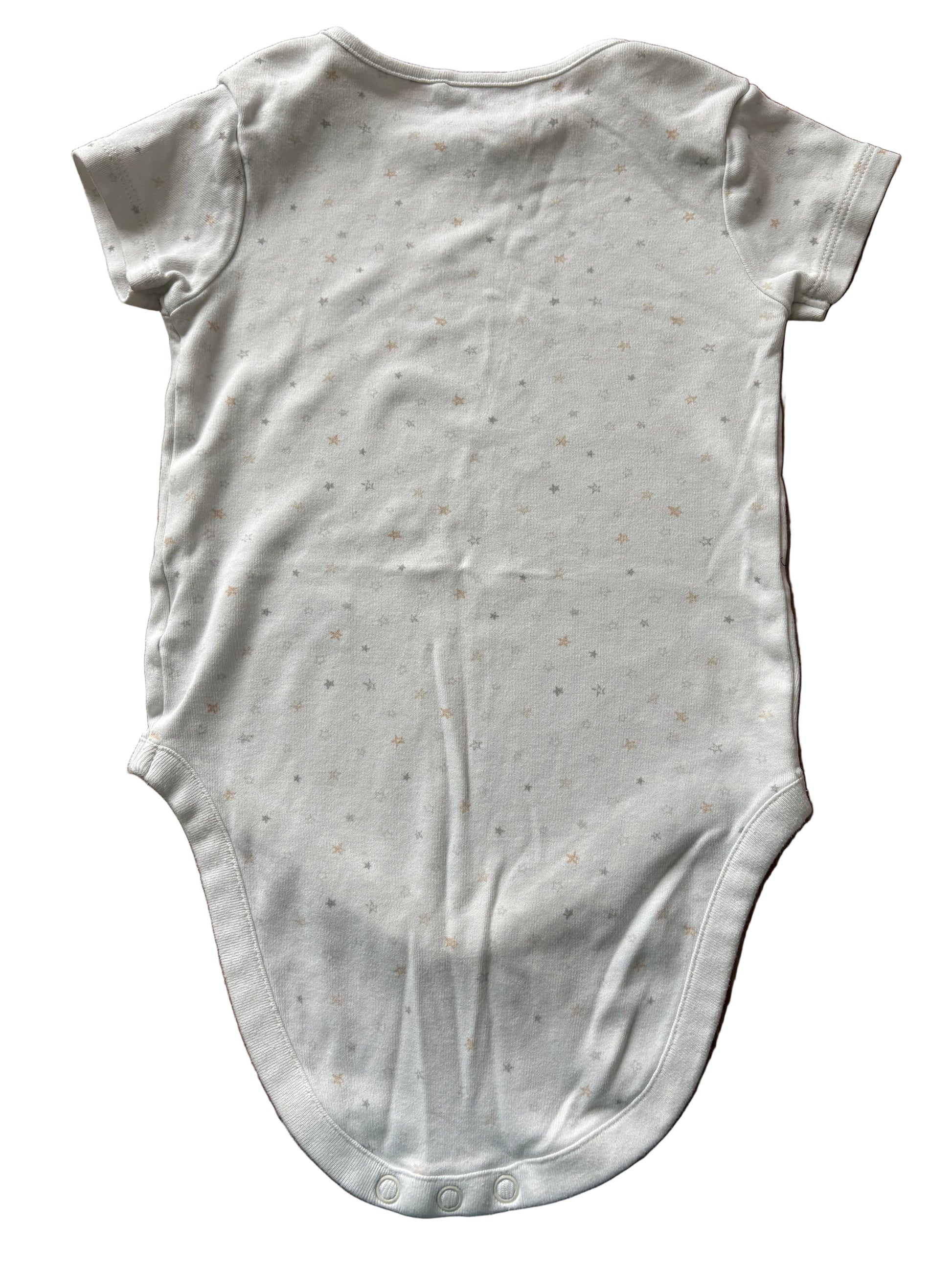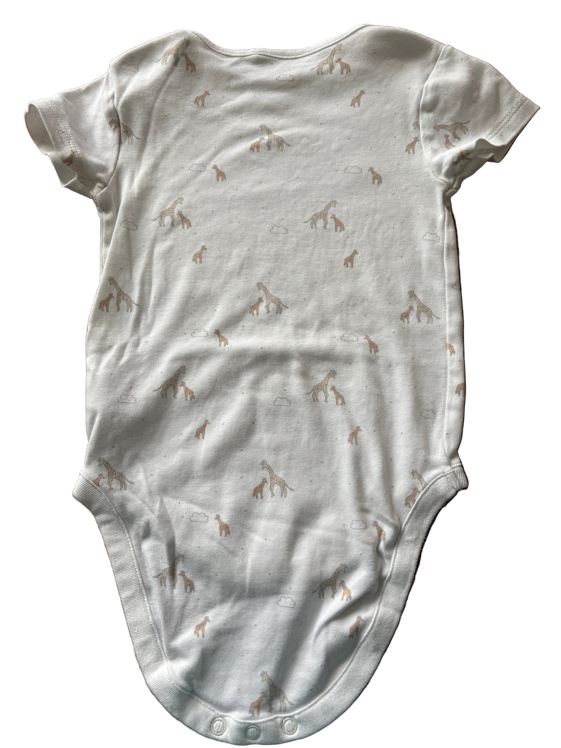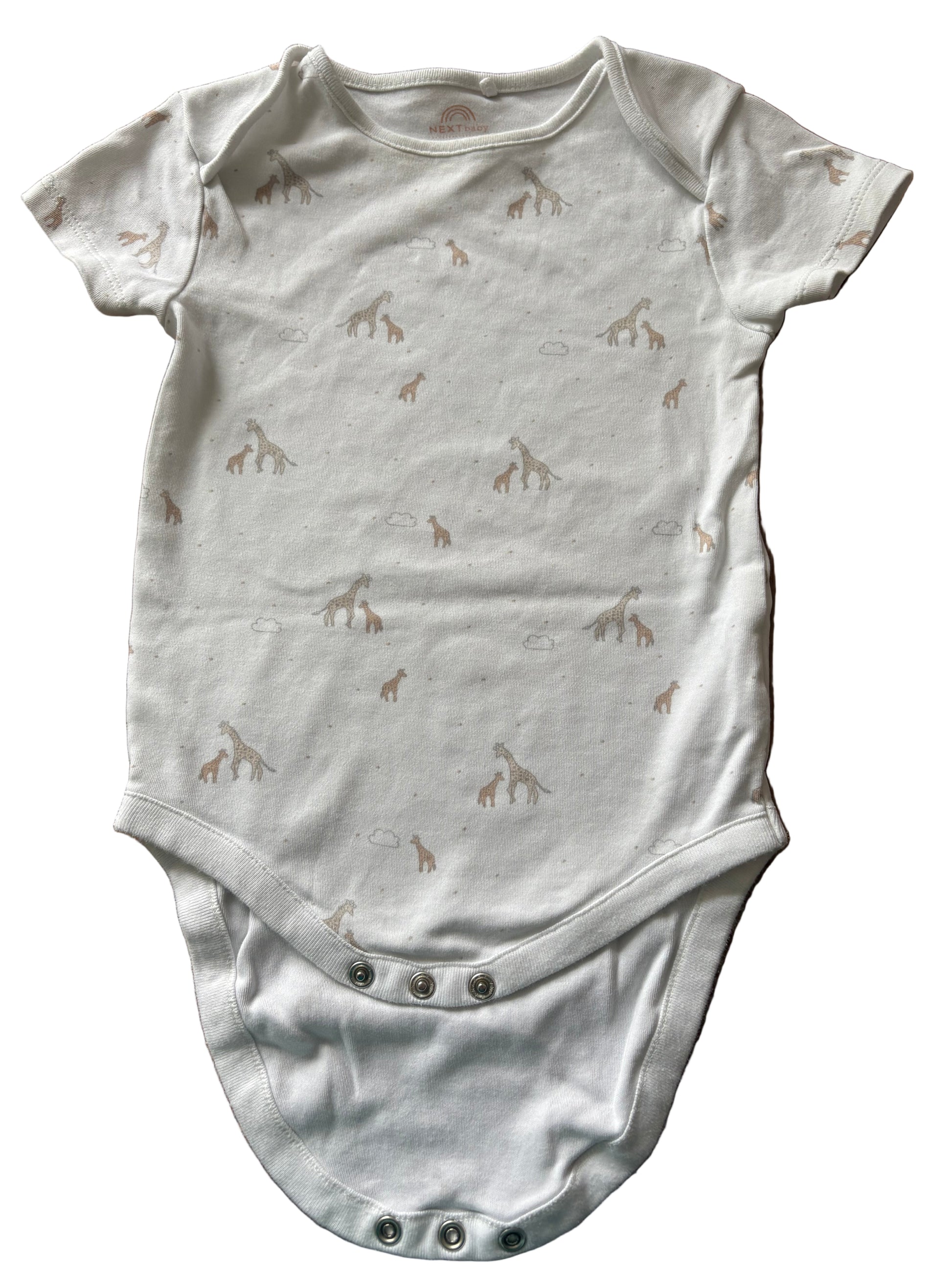 Set of 3 short-sleeve rompers with envelope necks. One is light pink with hearts, the other off white with giraffes and the last one off white with small stars. Size 92, 18 to 24 months from Next Baby 100% Cotton