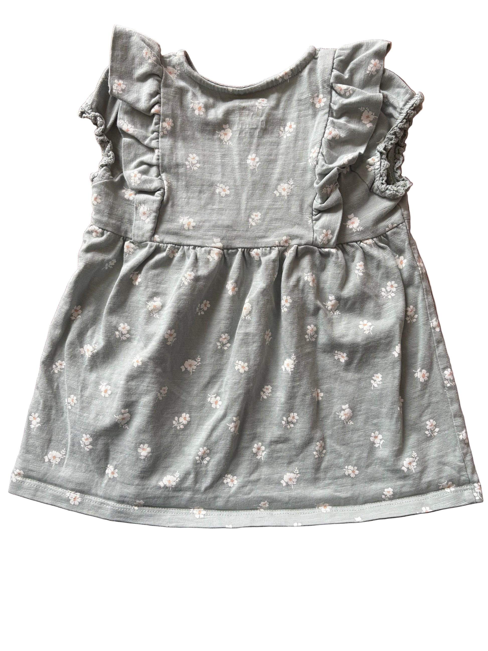 Light green short-sleeve dress with white flowers on the dress. The dress has buttons along the front and two frills. Size 98, 2 to 3 years from C&A 100% Cotton