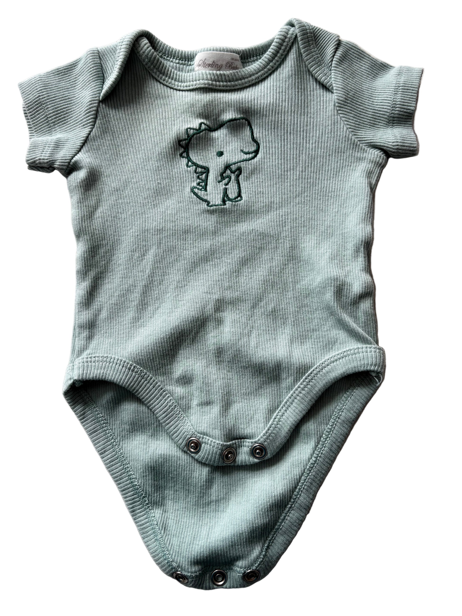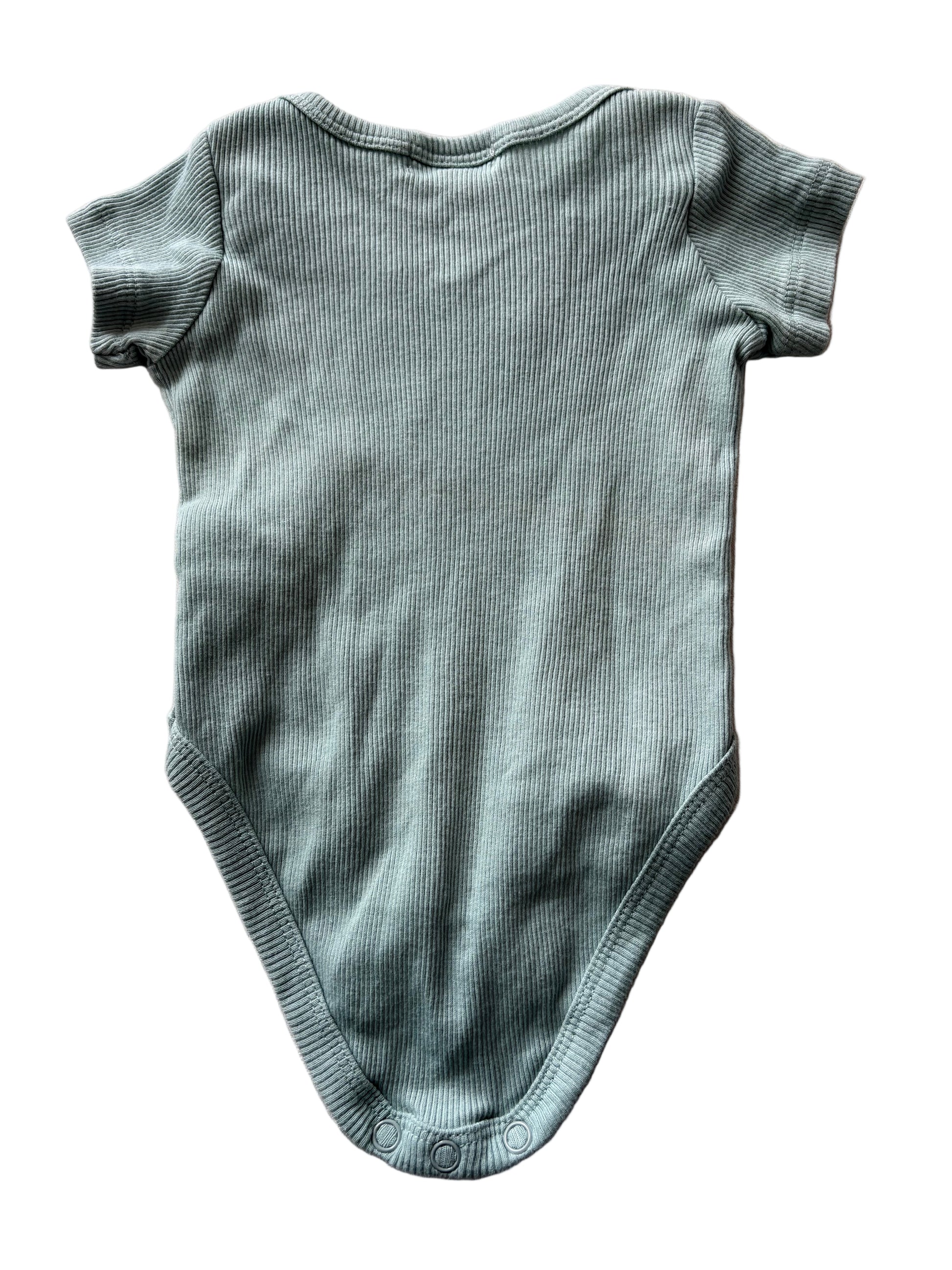 Light green short-sleeve romper with envelope neck. Size 60, 0 to 3 months from Sterling Baby 100% Organic Cotton