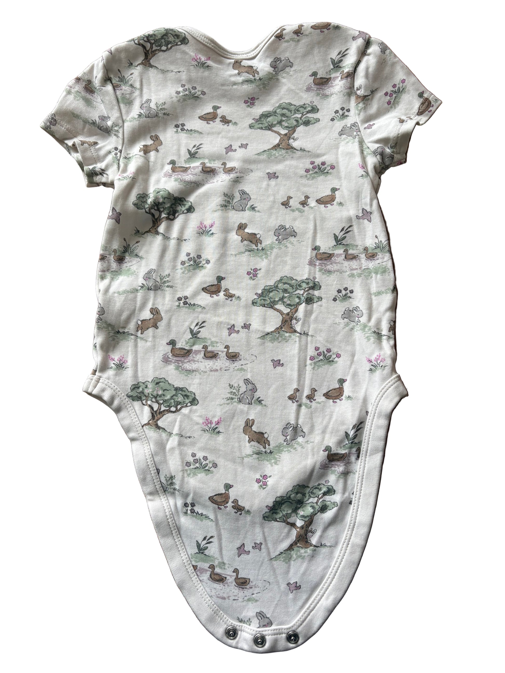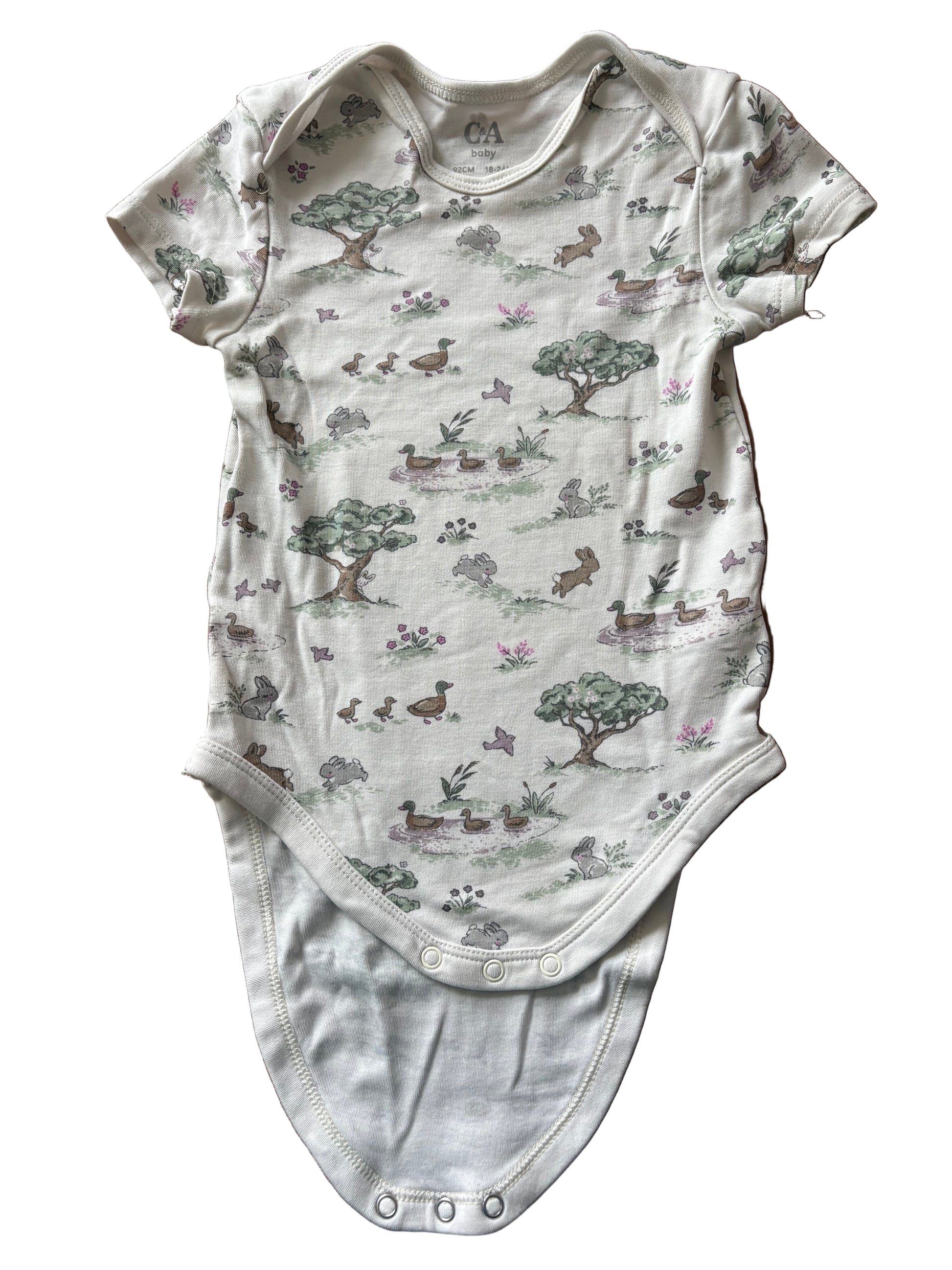 Cream short-sleeve romper with bunnies and an envelope neck. Size 92, 18 to 24 months from C&A 100% Cotton
